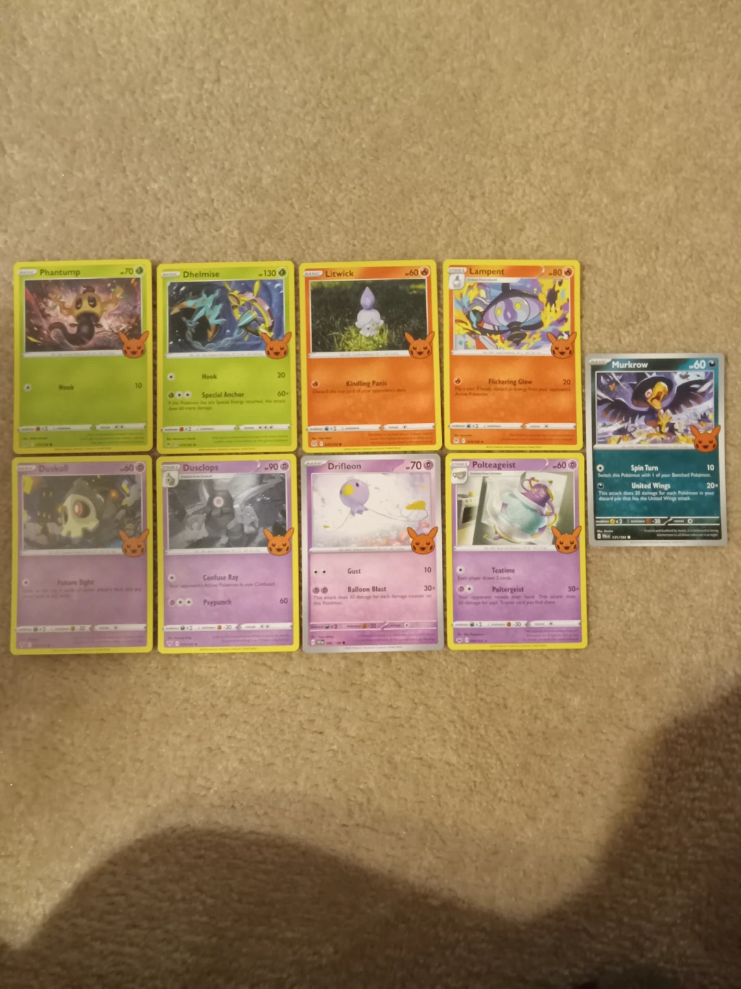 Selling a lot of Pokémon trading cards! Includes various Pokémon such as Phantump, Litwick, and Lampent. Great for collectors or players looking to expand their collection