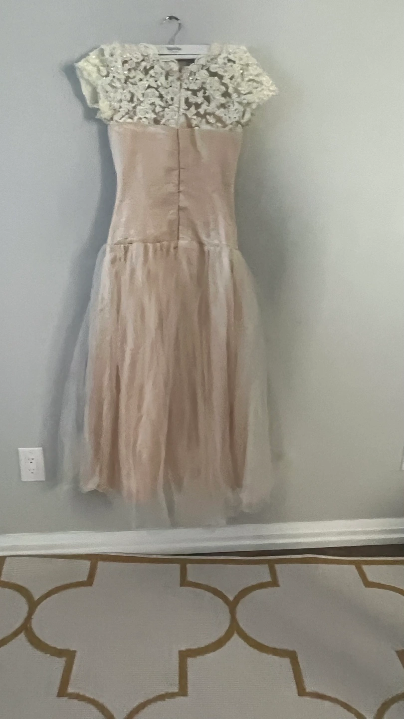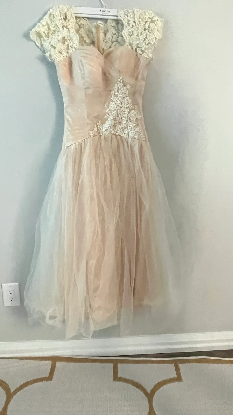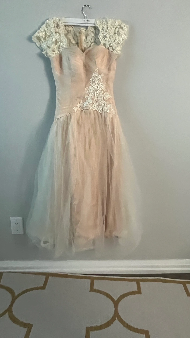 Selling a vintage-style dress in a soft, neutral colour. It features delicate lace detailing on the bodice and cap sleeves, and a flowing tulle skirt. Perfect for a special occasion or a unique addition to your wardrobe!
