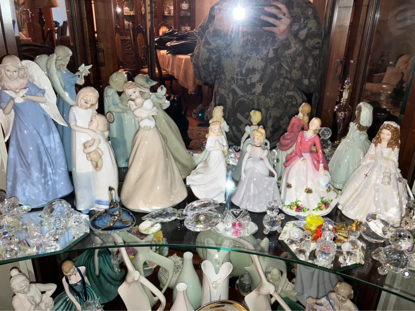 A collection of Precious Moments figurines featuring wedding couples, angels, and children. These decorative ceramic pieces add a charming touch to any display.