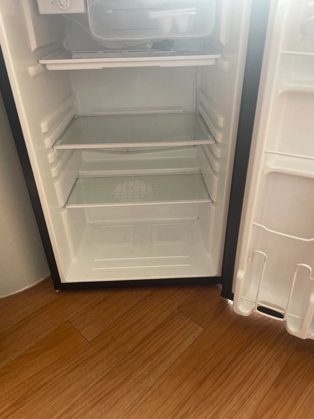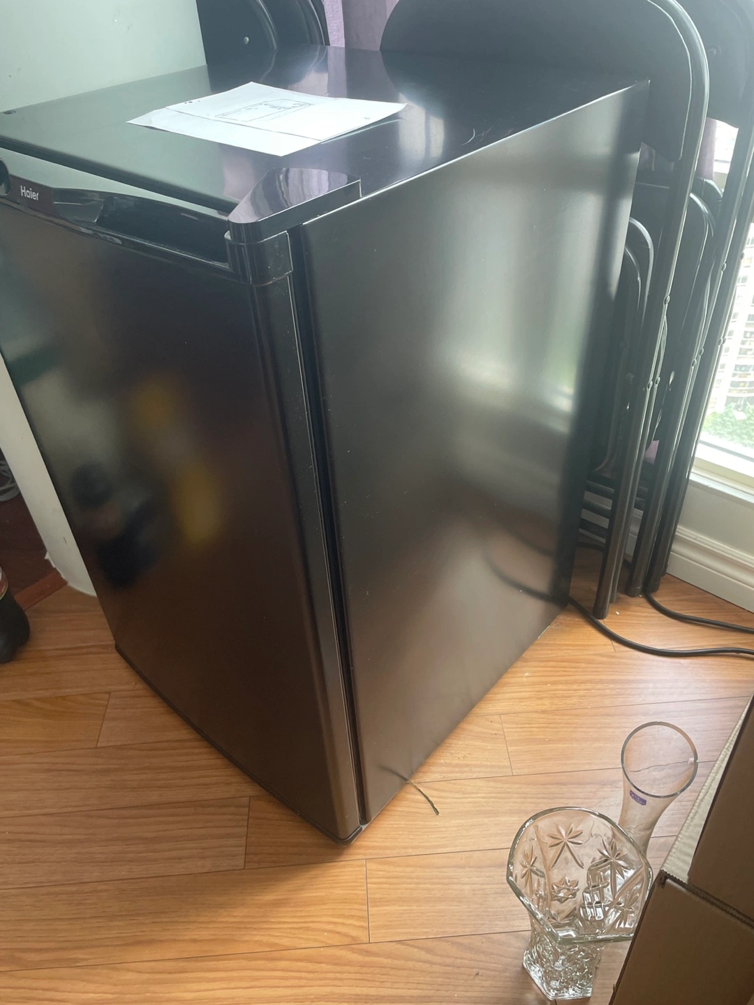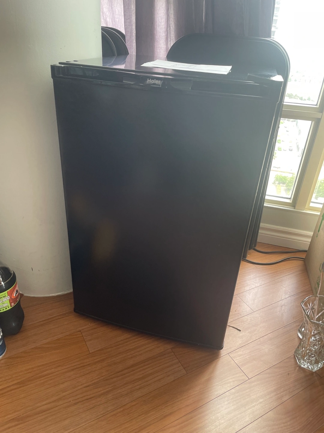Selling a Haier compact mini fridge in black. It's in good condition and perfect for a dorm room, office, or small apartment. It has adjustable shelves and a door that can hold bottles. It’s compact and doesn’t take up too much space!