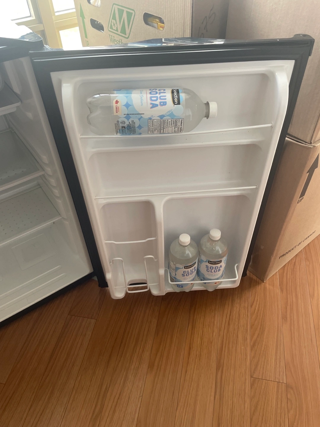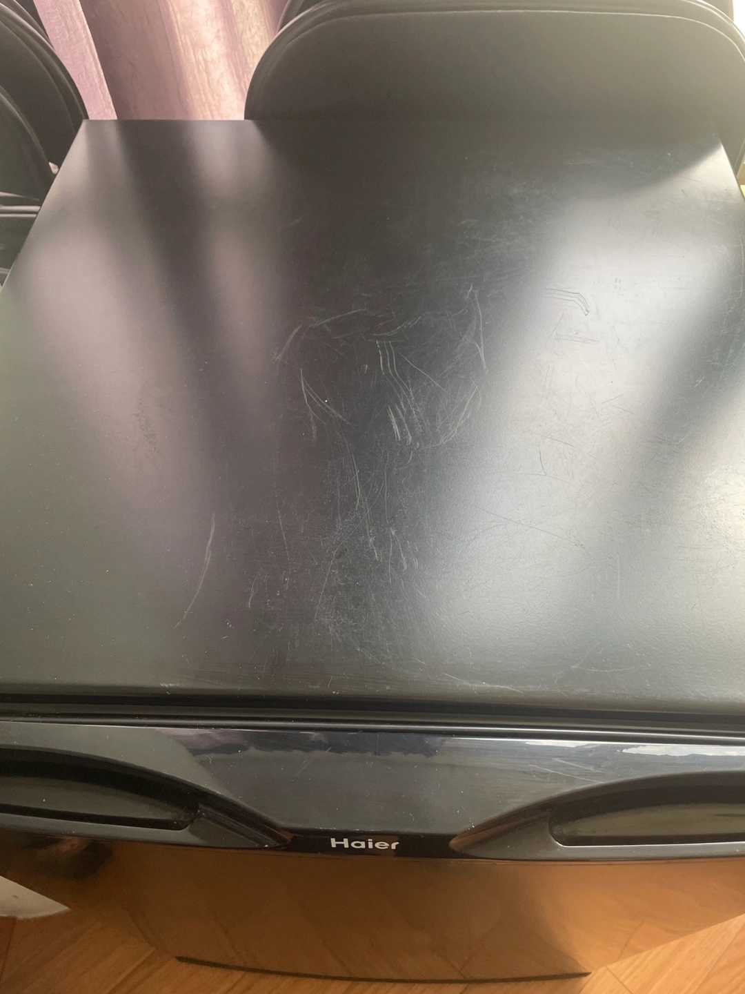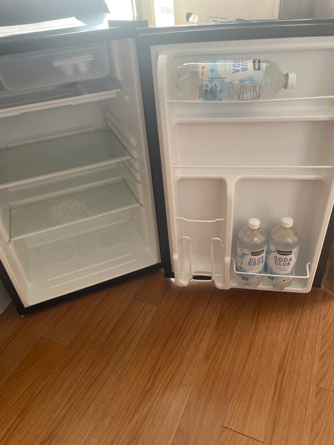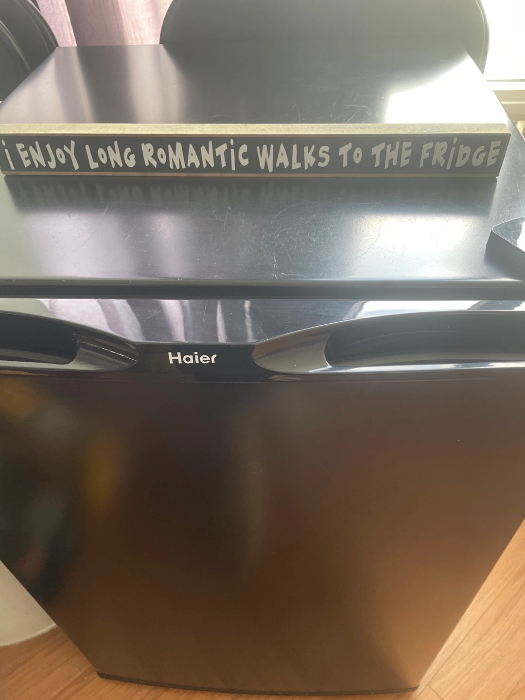 Selling a Haier compact mini fridge in black. It's in good condition and perfect for a dorm room, office, or small apartment. It has adjustable shelves and a door that can hold bottles. It’s compact and doesn’t take up too much space!