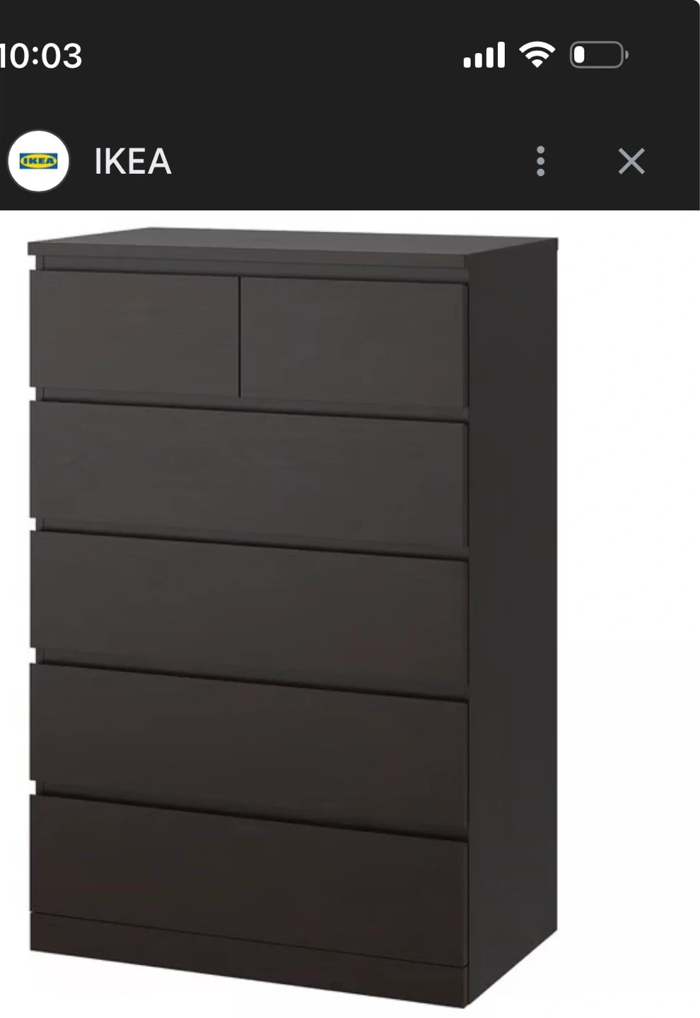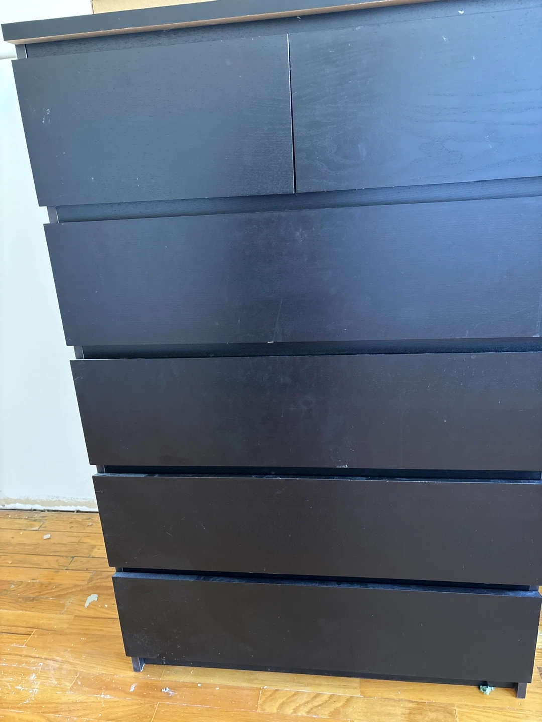 Black 6-drawer dresser. This unit's finish shows some signs of wear. It's perfect for organizing clothes and linens in a bedroom or closet.