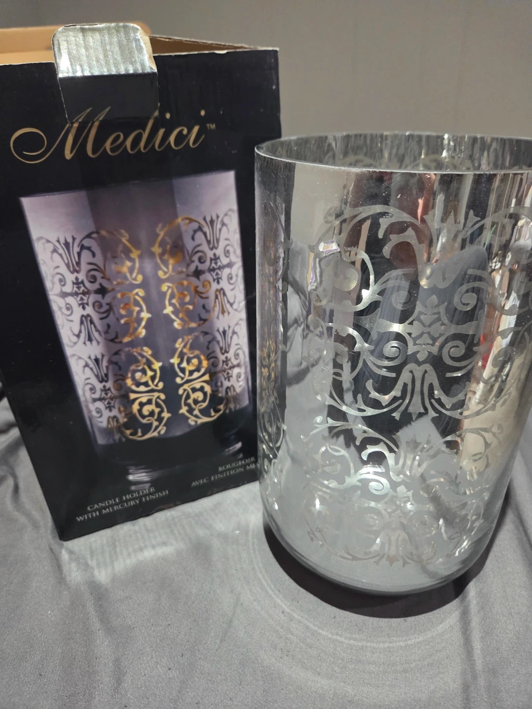 Medici candle holder with a silver mercury finish. Candles are not included. Brand new unused. Diameter 15cm and height is 24cm.