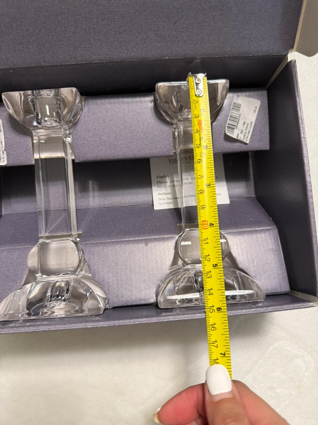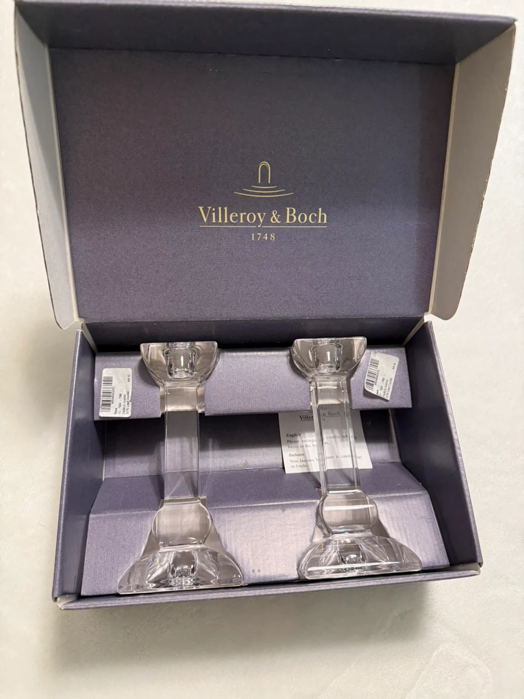 Selling a beautiful set of two Villeroy & Boch crystal candlestick holders! They come in their original box and are in excellent condition. These elegant candlestick holders would make a lovely addition to any home