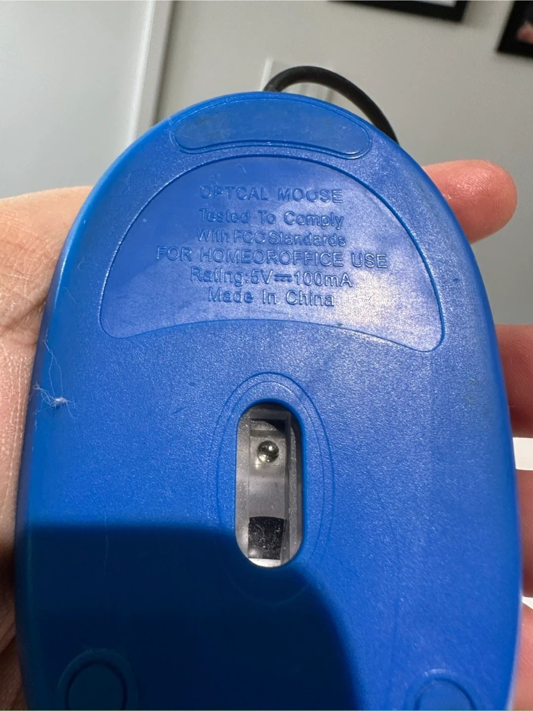 Selling a blue optical mouse, perfect for home or office use. It is tested to comply with FCC standards. The rating is 5V - 100mA. Made in China