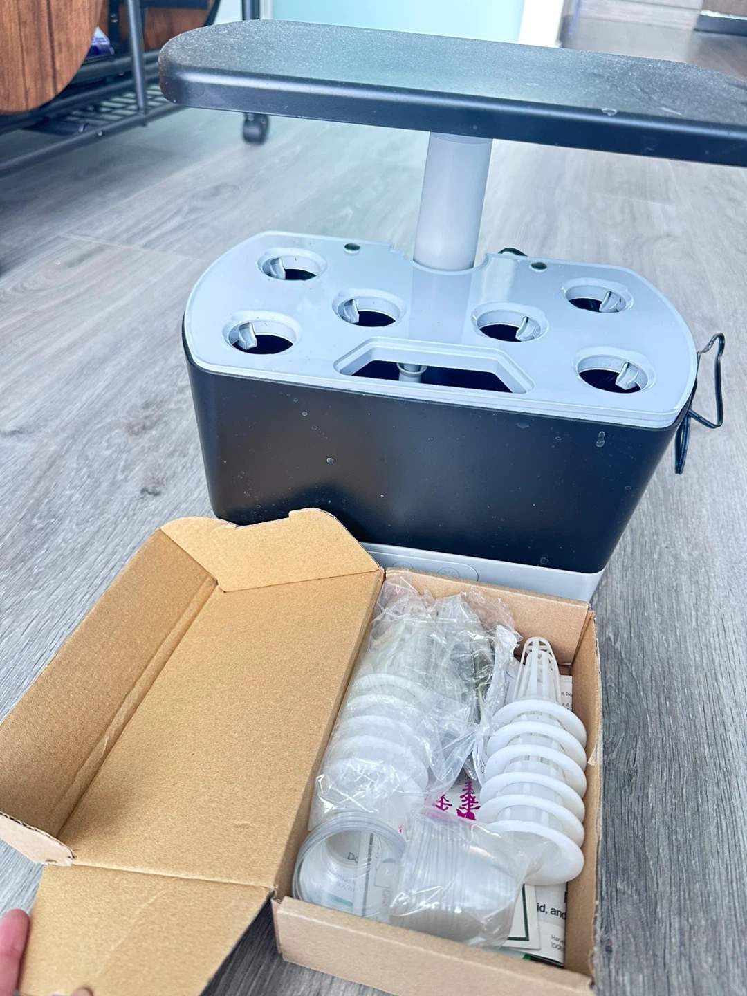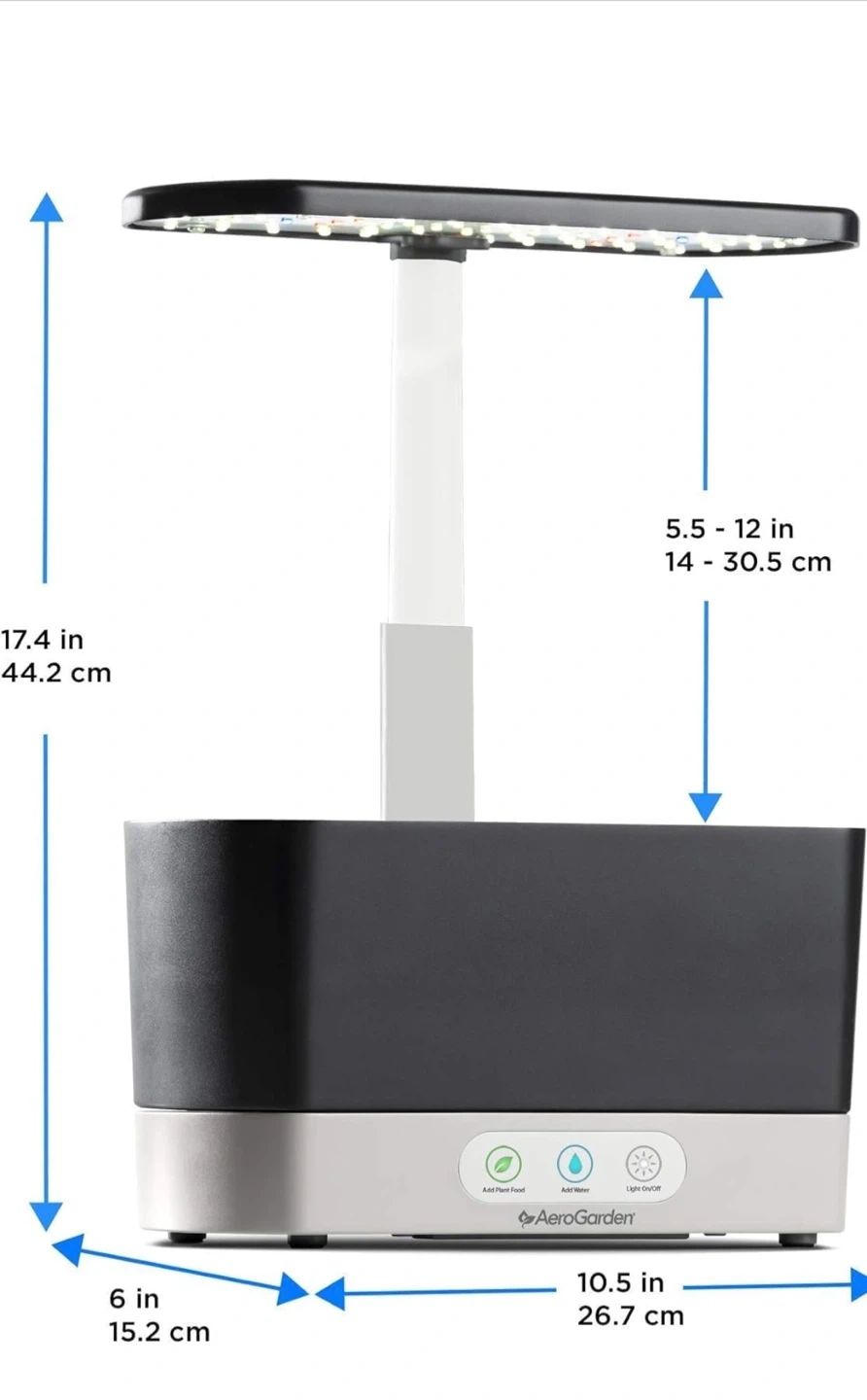 I'm selling an AeroGarden Harvest Indoor Garden Hydroponic System with LED Grow Light and Herb Kit. It holds up to 6 pods and comes in black. Dimensions are approximately 17.4 inches in height, 10.5 inches in width, and 6 inches in depth. It also comes with its original box and components! Gifts, Seed Pod Kit for Aerogarden