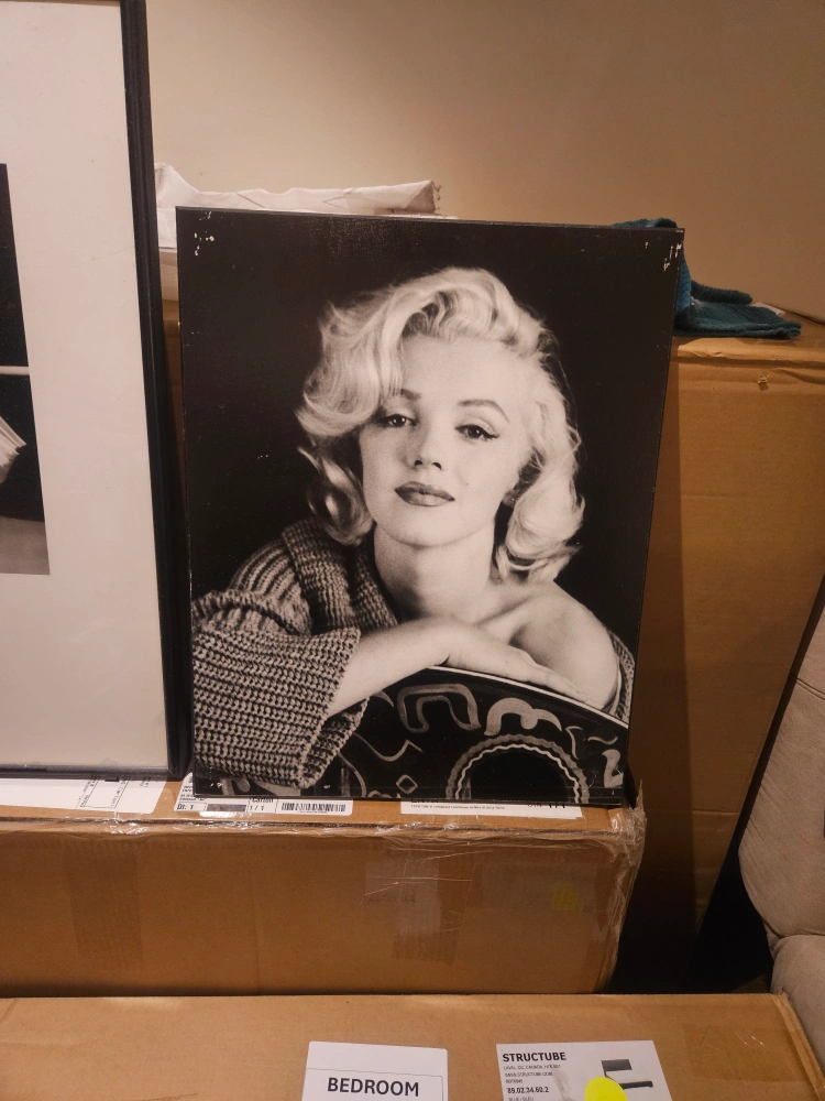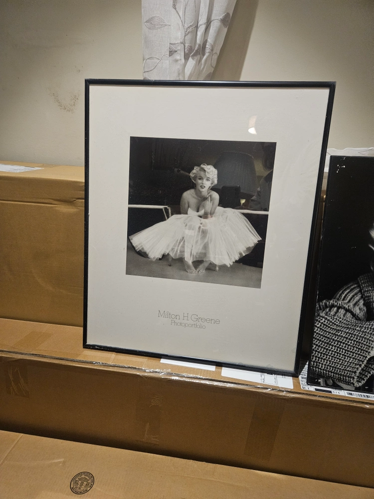 Framed black and white photo of Marilyn Monroe. Signed 'Milton H Greene Photoportfolio'