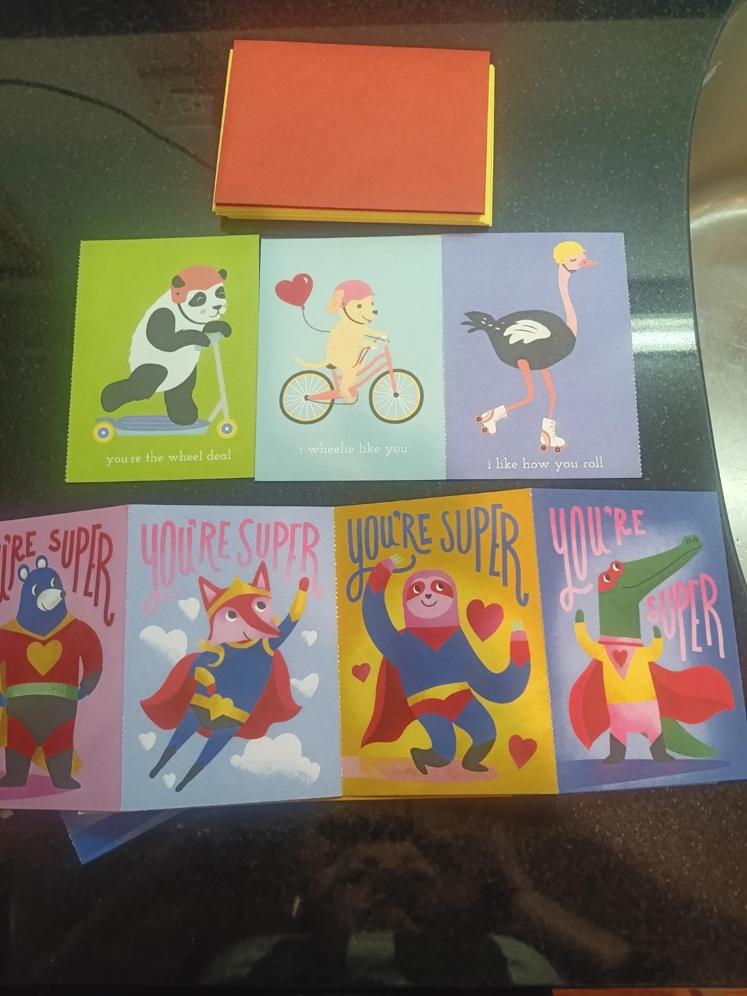 This set includes several fun greeting cards with adorable animal designs and playful messages. You'll find cards with a panda on a scooter, a dog on a bike, an ostrich on roller skates, and superhero animals. They're perfect for sending a cheerful note!