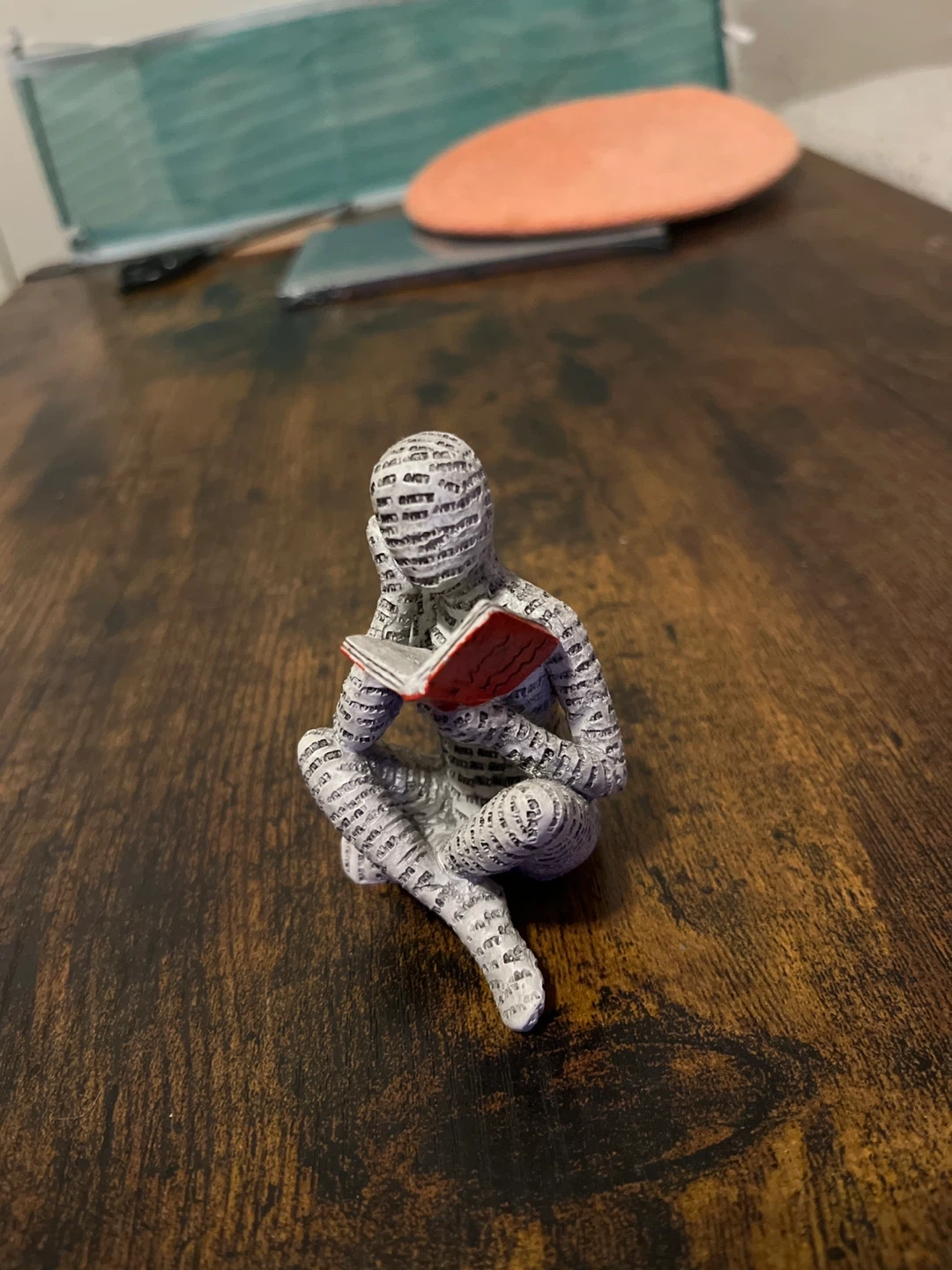 Figurine of a person reading, covered in text