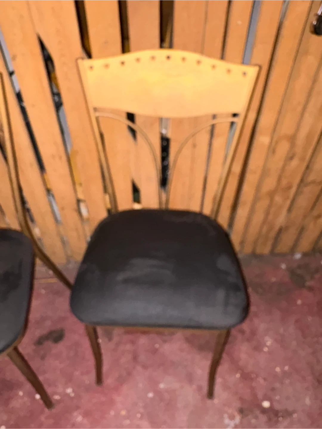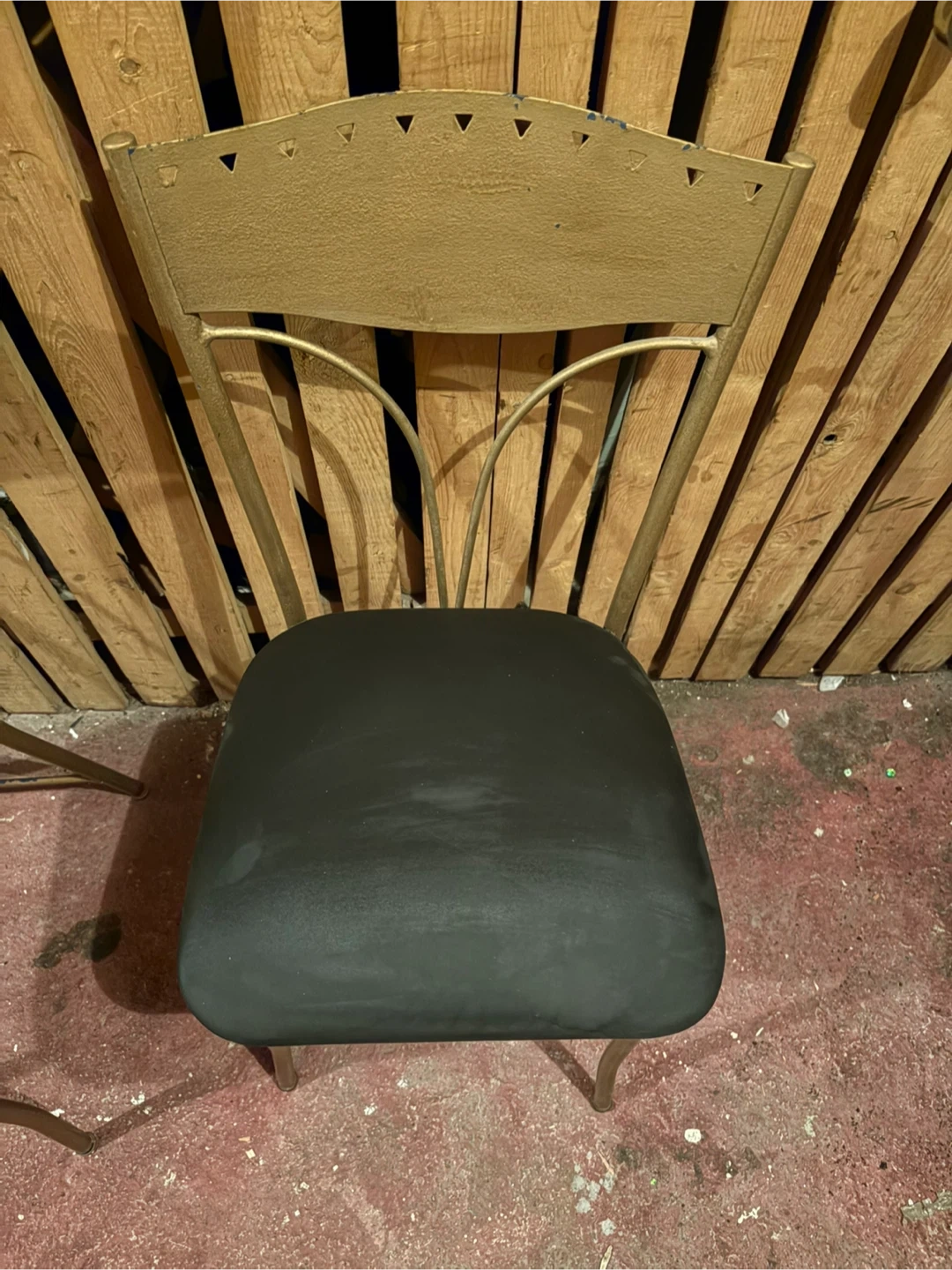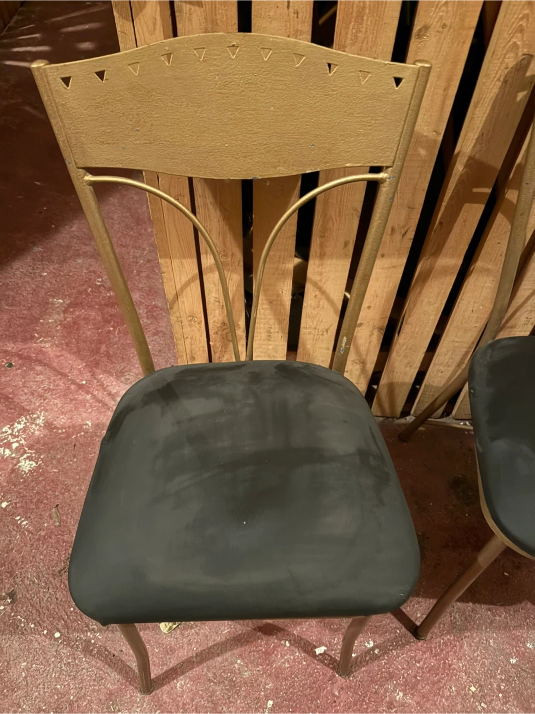Charming set of four dining chairs. Features a gold-toned metal frame with decorative detailing on the backrest. Each chair has a comfortable black upholstered seat. Sturdy construction for everyday use.