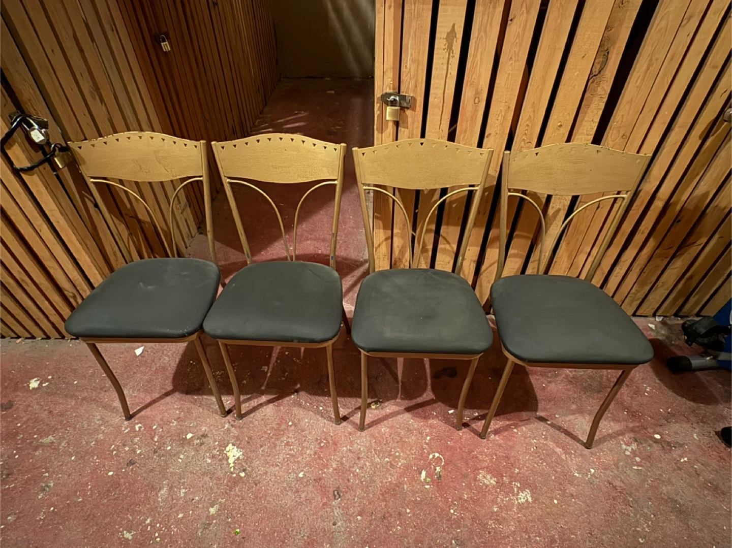 Charming set of four dining chairs. Features a gold-toned metal frame with decorative detailing on the backrest. Each chair has a comfortable black upholstered seat. Sturdy construction for everyday use.