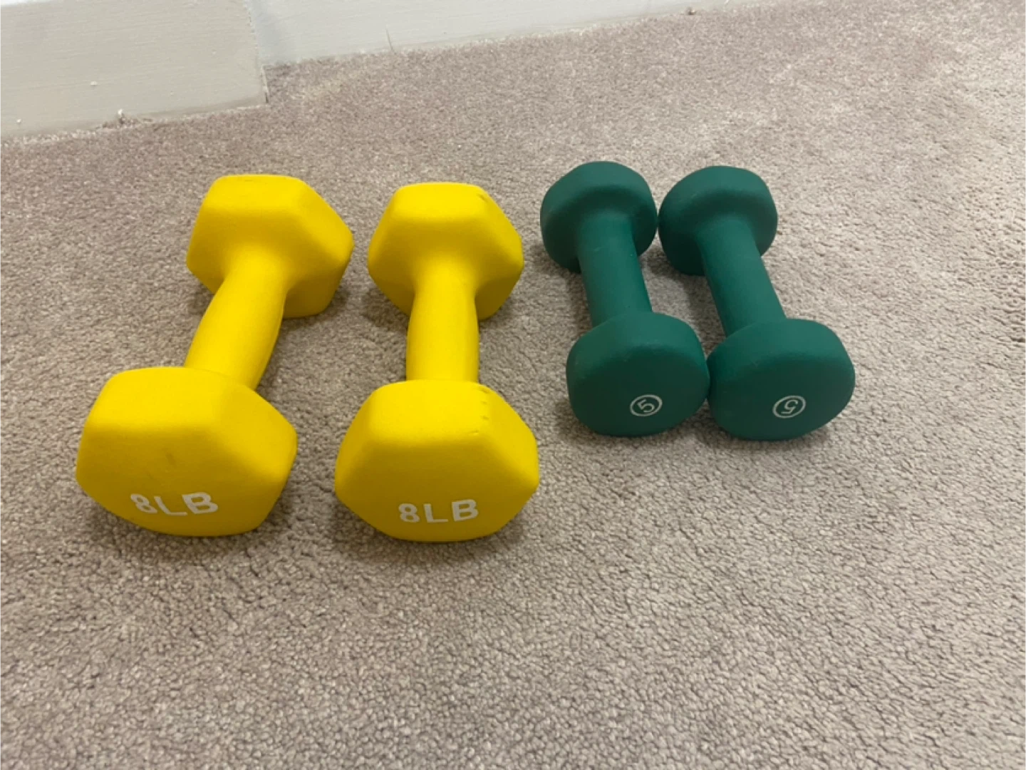 Two yellow 8lb dumbbells and two green 5lb dumbbells. They're coated for a better grip.