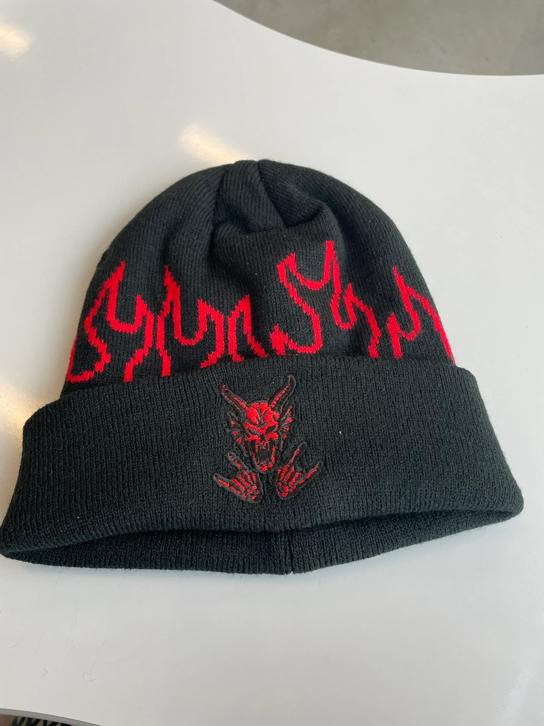 This black knit beanie features a bold red flame design wrapping around the top and a stitched devil graphic on the front. It's a warm and stylish accessory. One size fits most.