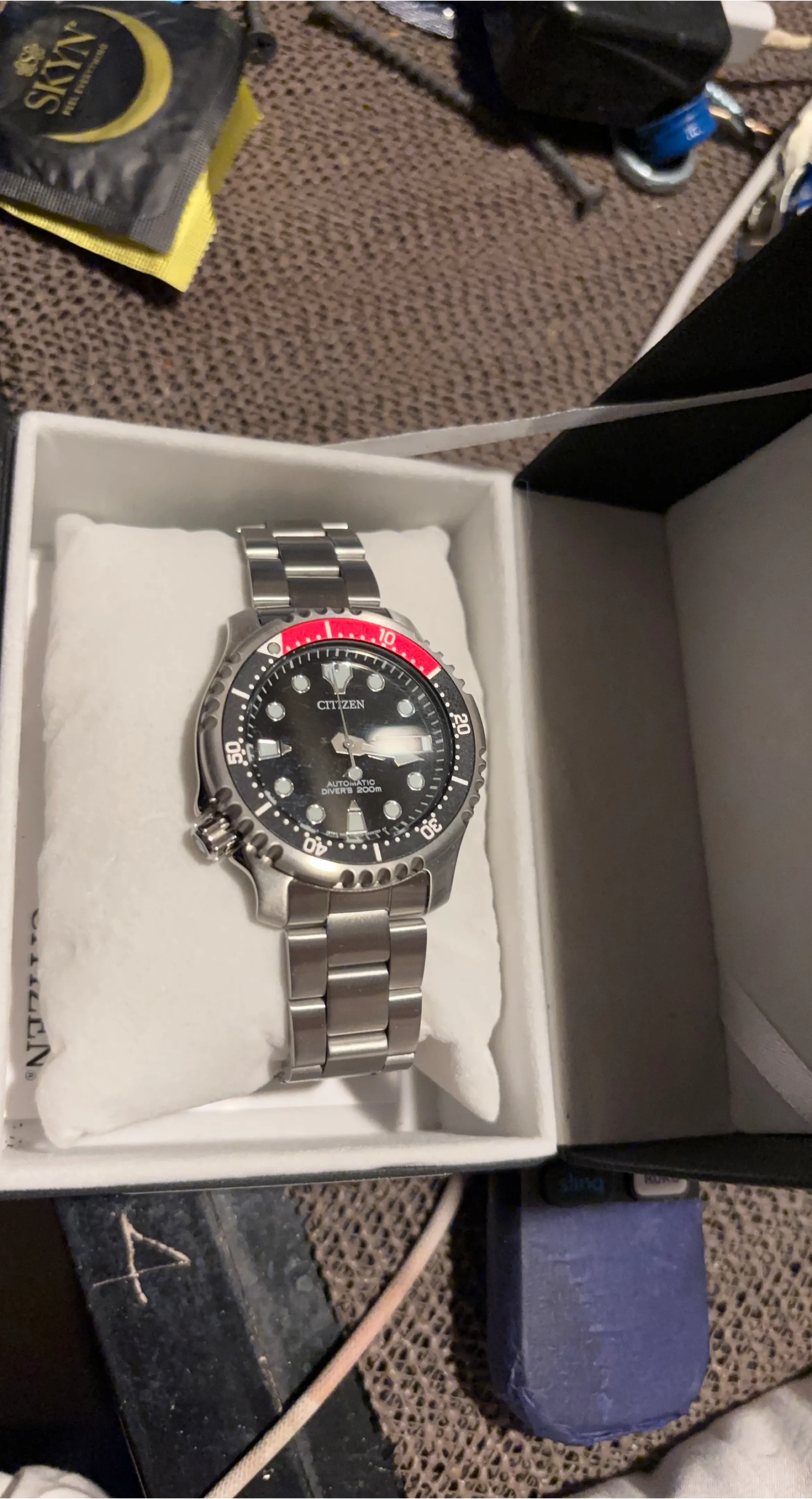 This is a Citizen automatic diver's watch with a 200m water resistance rating. It has a black dial and a stainless steel bracelet. The watch comes in its original box.