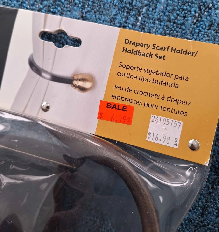 2 pairs of Umbra Scarf Holder / Holdback Sets in brown marble tone. Packaging never opened, sealed with hardware included. $5 each pair. Pick up in the Bloomington and 9th line area.