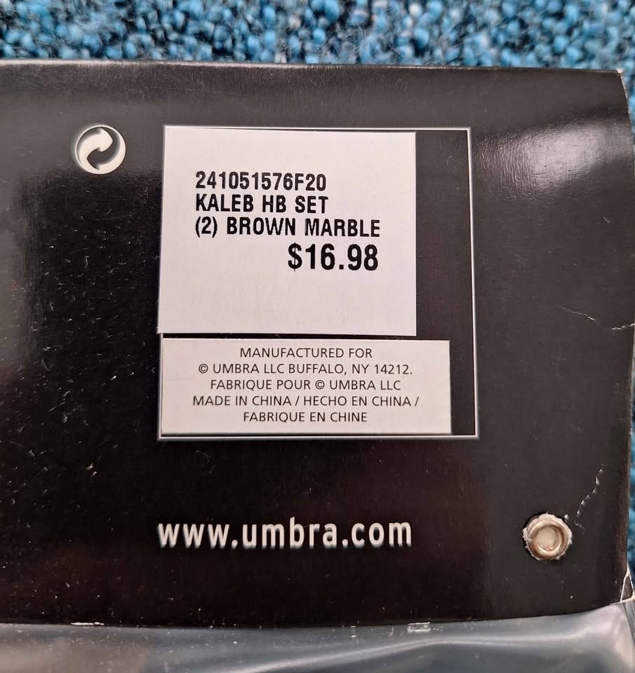 2 pairs of Umbra Scarf Holder / Holdback Sets in brown marble tone. Packaging never opened, sealed with hardware included. $5 each pair. Pick up in the Bloomington and 9th line area.