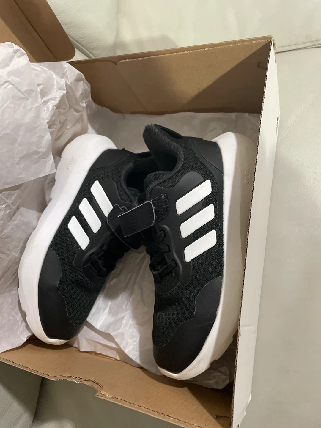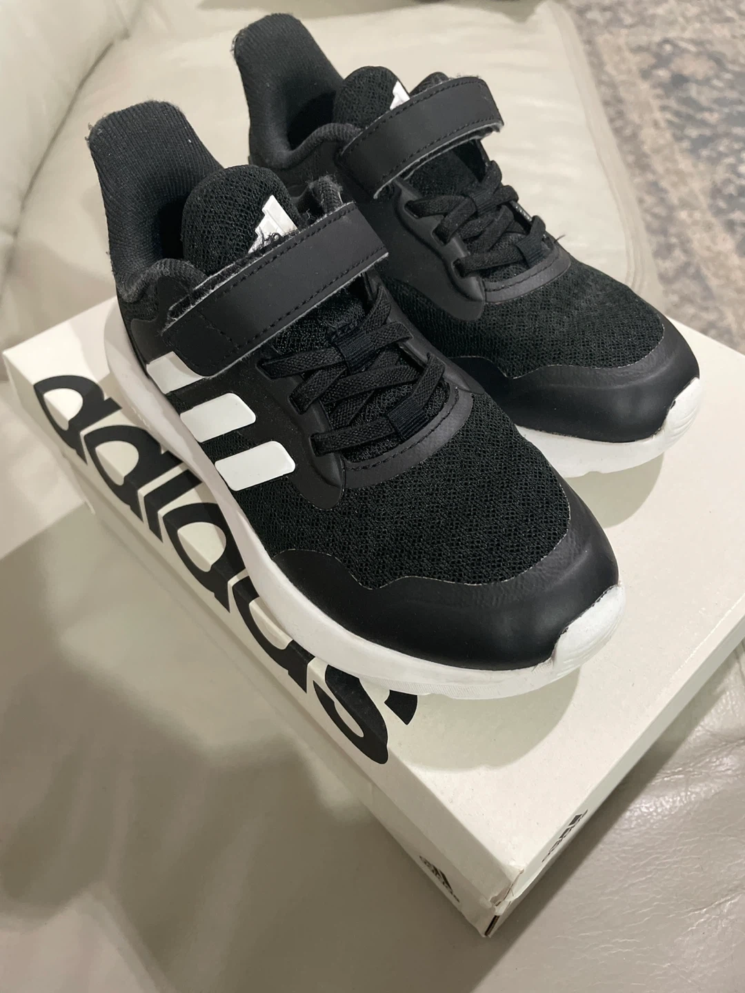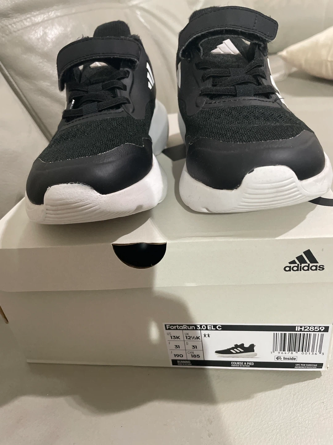 These black and white Adidas FortaRun 3.0 EL C kids' shoes are ready for adventure. They feature a comfortable mesh upper with hook-and-loop closure for easy on and off. Includes original box.