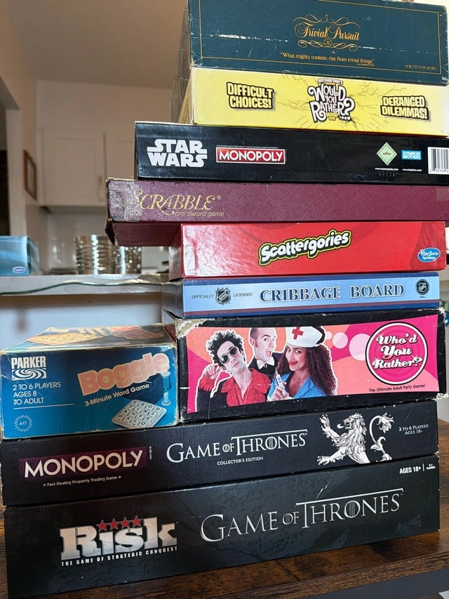 A collection of used board games for sale, perfect for vintage game nights or adding to your collection. Games include Vintage Trivial Pursuit, Star Wars Monopoly, Scrabble, Scattergories, Maple Leafs Cribbage Board, Vintage Boggle, Would You Rather, Who'd You Rather, Game of Thrones Monopoly, and Risk Game of Thrones. Some are in like-new condition with all pieces. If the ad is up, the games are available. Cash accepted.