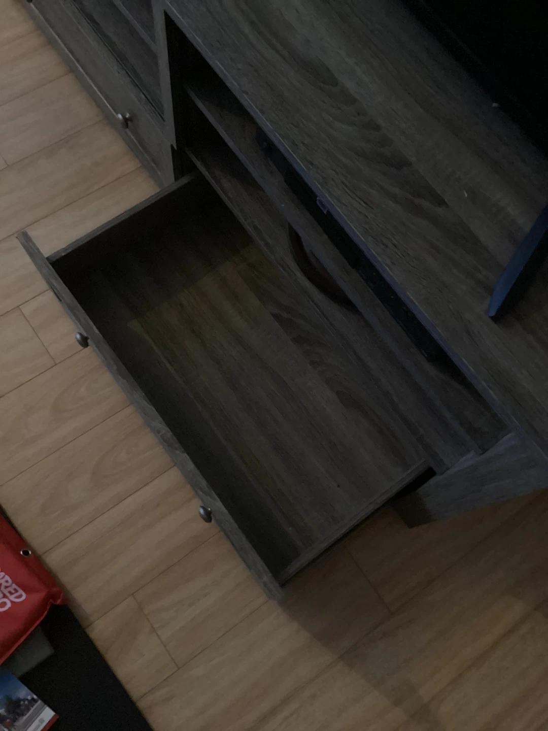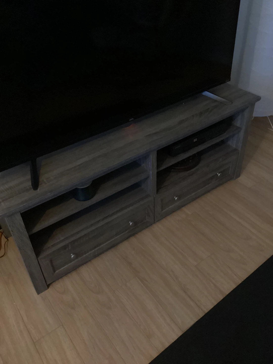 For Living Bristol Bay TV Stand with two drawers and open shelving. It's made of wood-look material in a greyish brown finish. This stand offers ample storage and display space. Measures 54” long