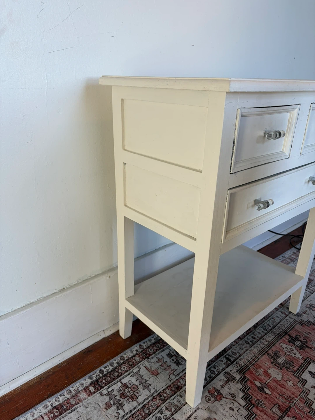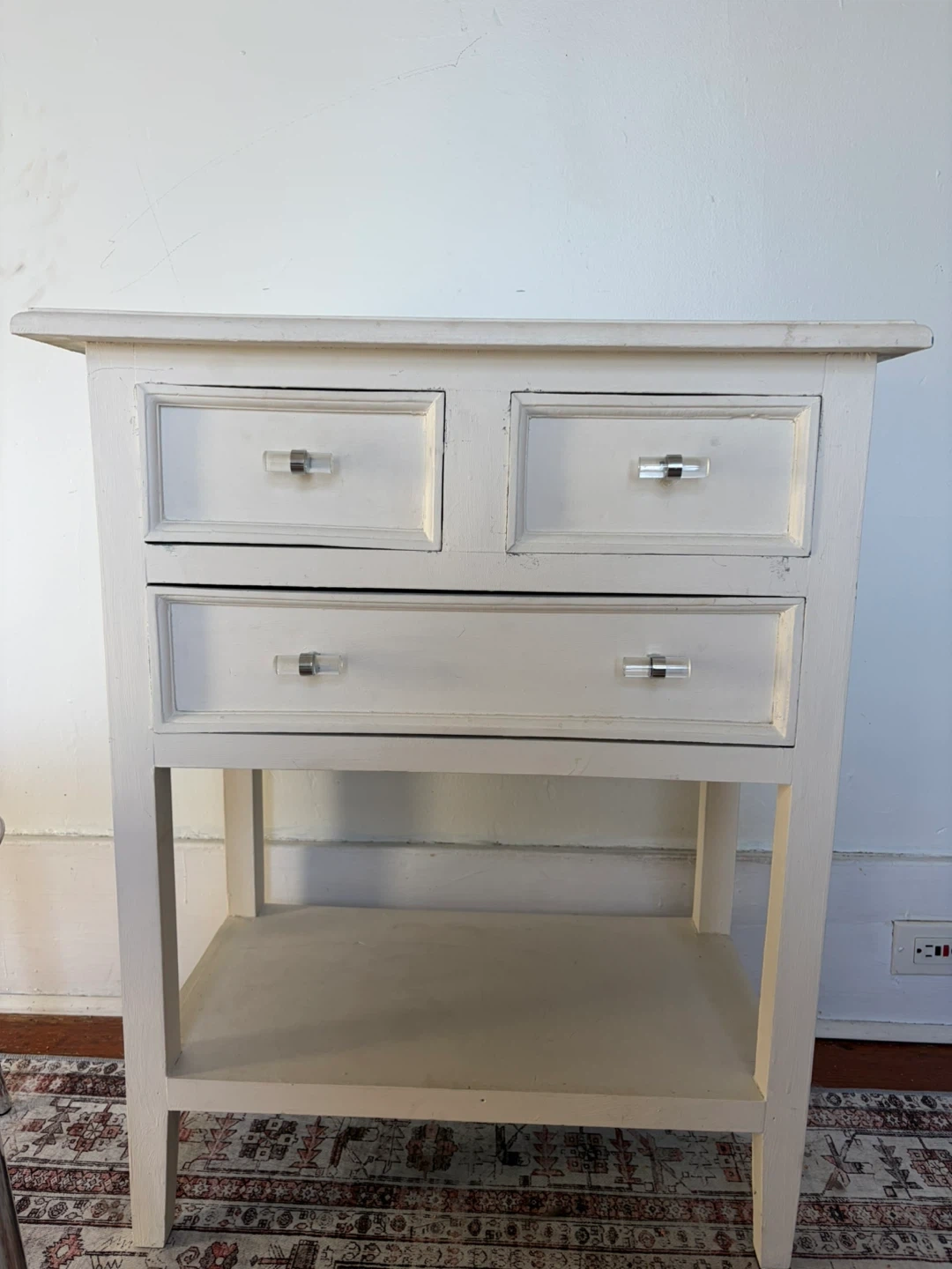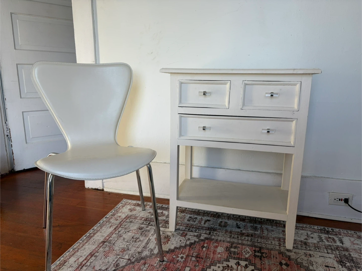 Side table, with three drawers, has some wears and tears as seen in photos, also comes with the white chair. White chair is in excellent condition.