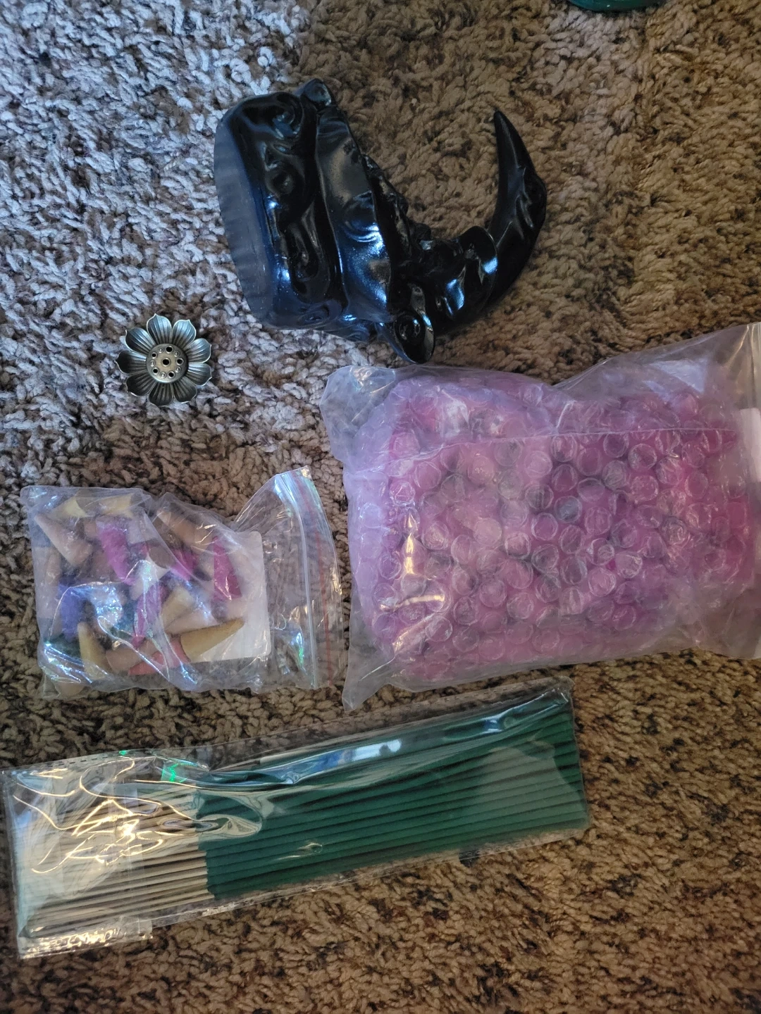 This set includes a black crescent moon shaped incense holder, a metal lotus flower incense burner, a pack of green incense sticks, and a bag of assorted incense cones. It's great for creating a relaxing atmosphere.