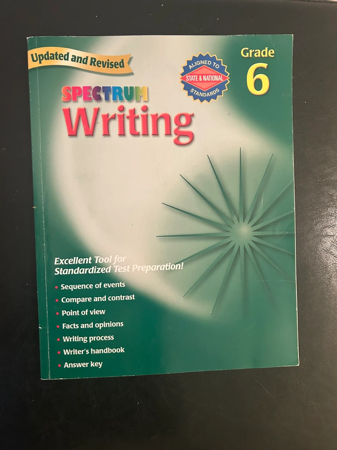 This is the updated and revised Spectrum Writing workbook for Grade 6. It's aligned to state and national standards and is an excellent tool for standardized test preparation. The workbook covers topics like sequence of events, compare and contrast, point of view, facts and opinions, writing process, and includes a writer's handbook and answer key.