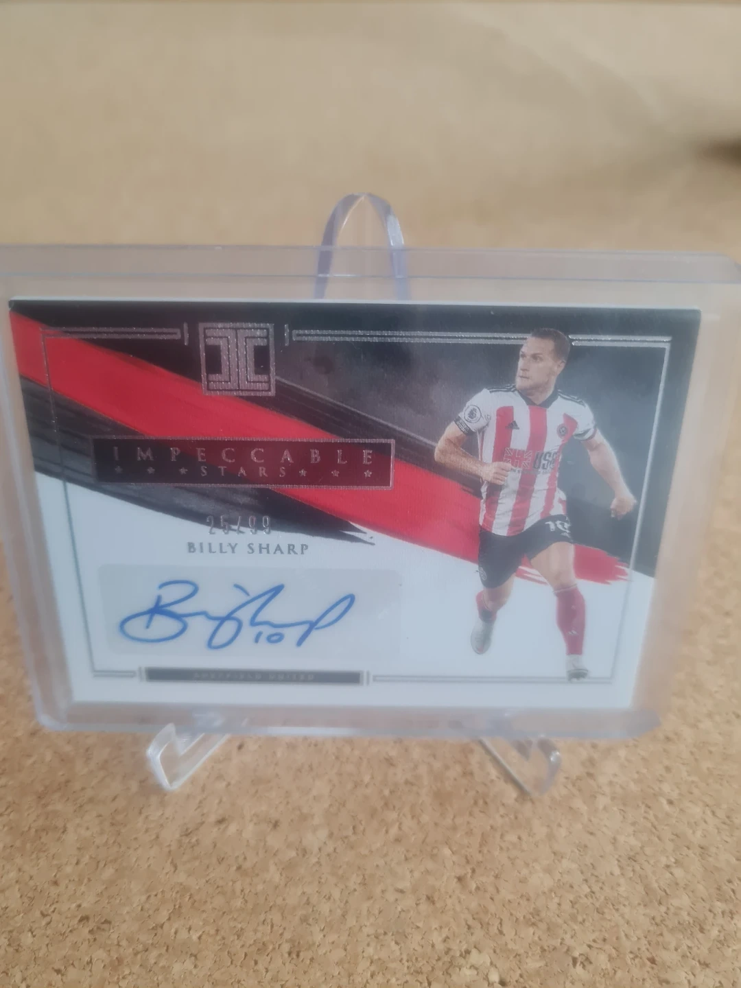 This is a 2022-23 Impeccable trading card featuring an autograph from Billy Sharp. It's serial numbered 25/99. This card is perfect for any Sheffield United fan or football card collector.