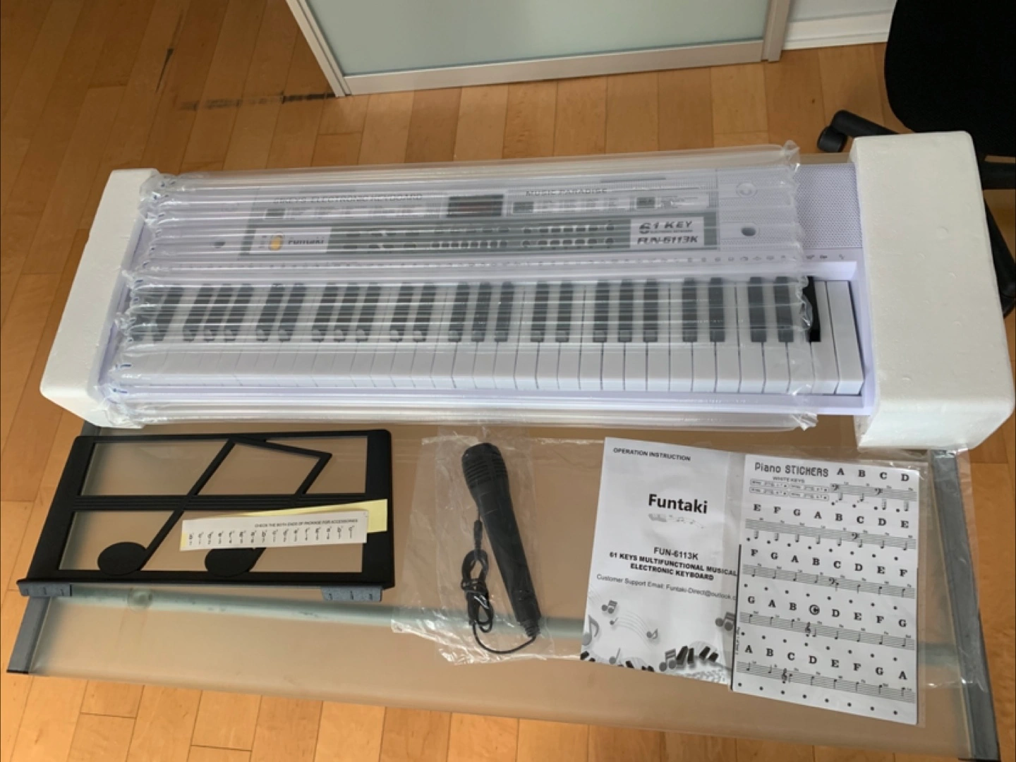 Includes microphone, charger, sheet music, and music stand.
