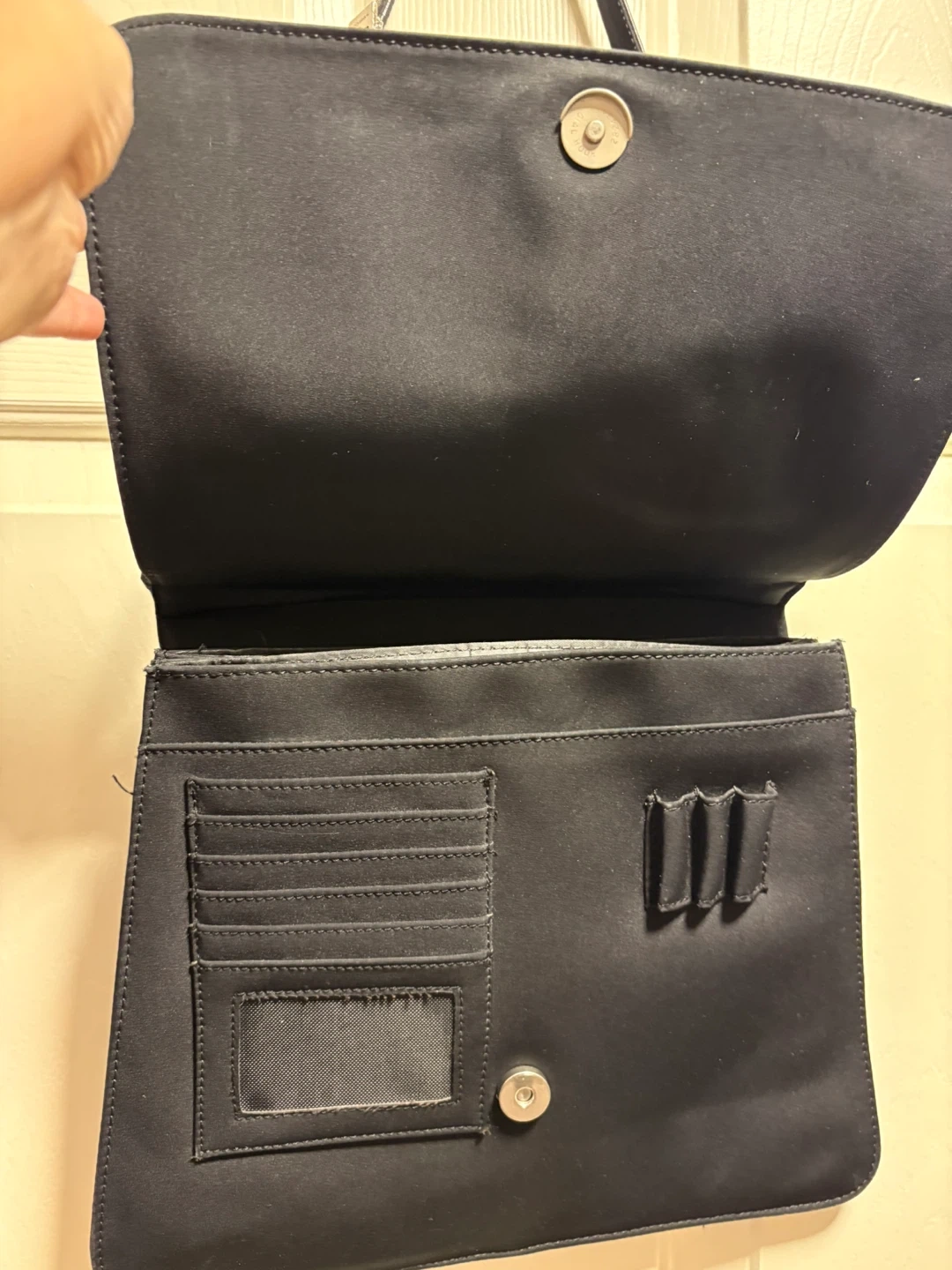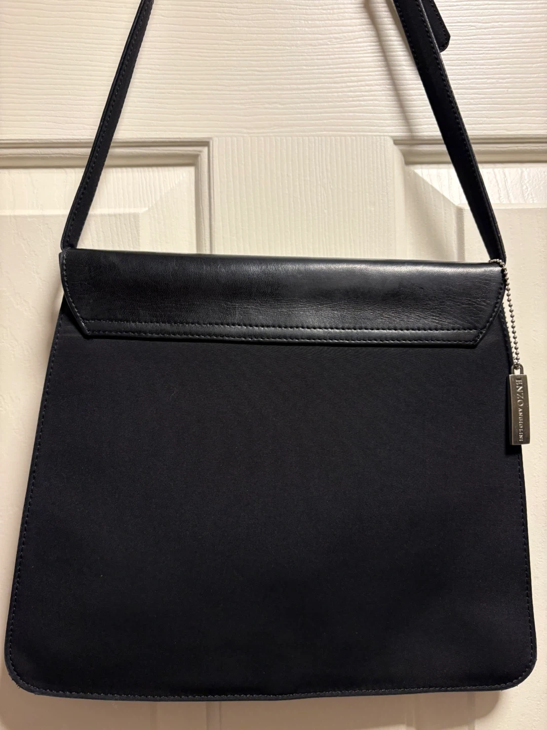 This is a black shoulder bag by Enzo Angiolini. It's a classic design with an elegant black leather flap closure and an adjustable leather strap. The rest of the bag is made of high quality nylon material. Great like new condition! Beautiful and classy shoulder bag! Pick up in Chestermere