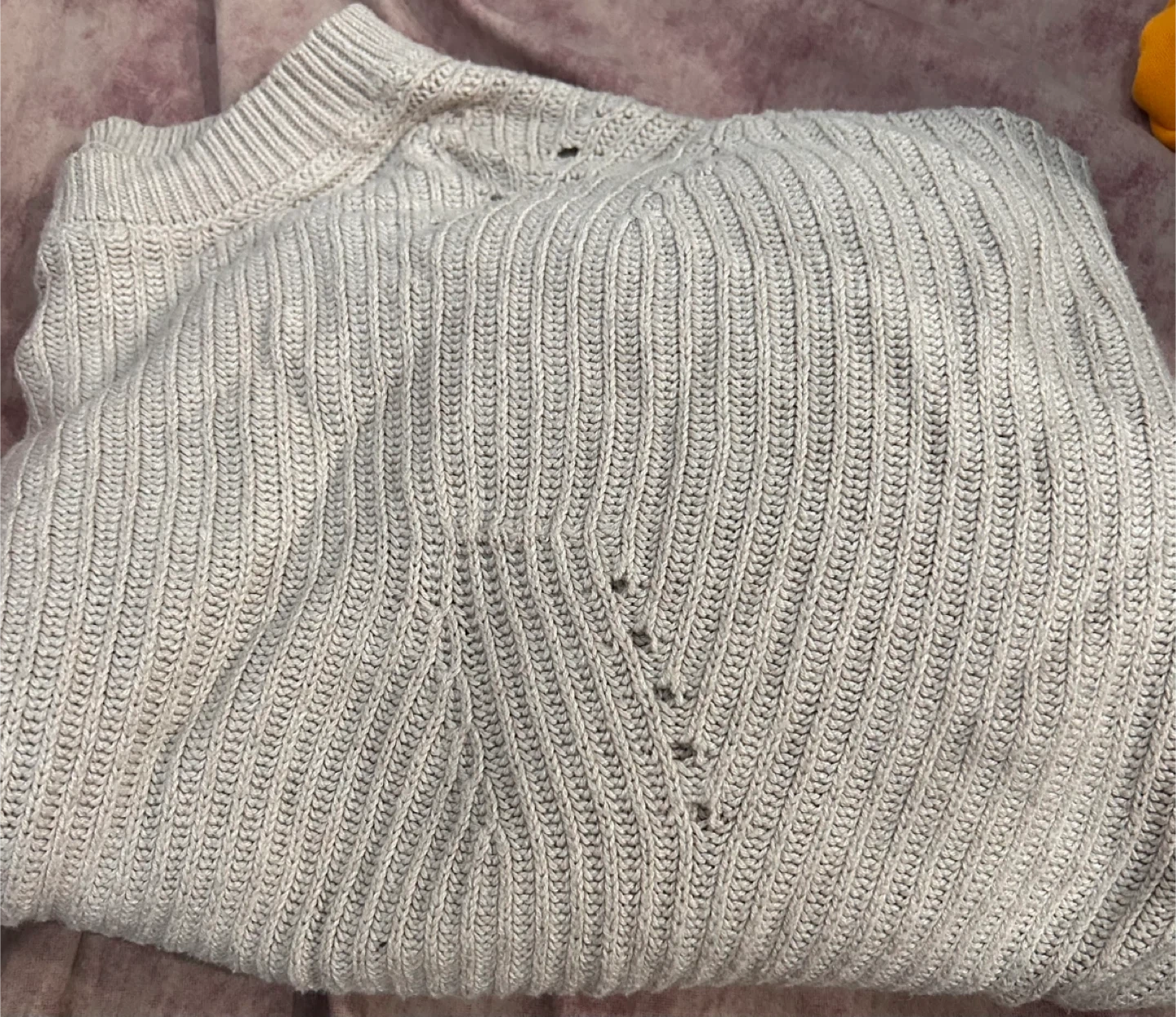 A light grey ribbed knit sweater. It's a comfortable layering piece for cooler weather. The knit is a mix of materials for a soft feel. This sweater is great for casual everyday wear.
