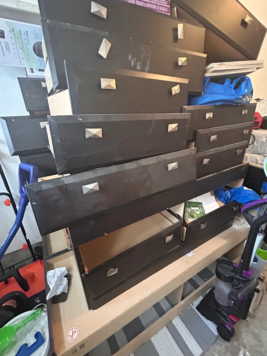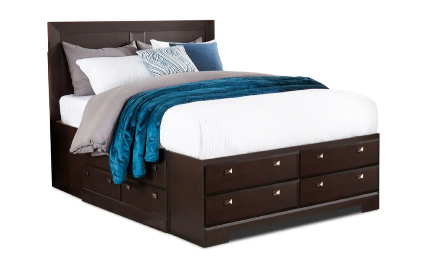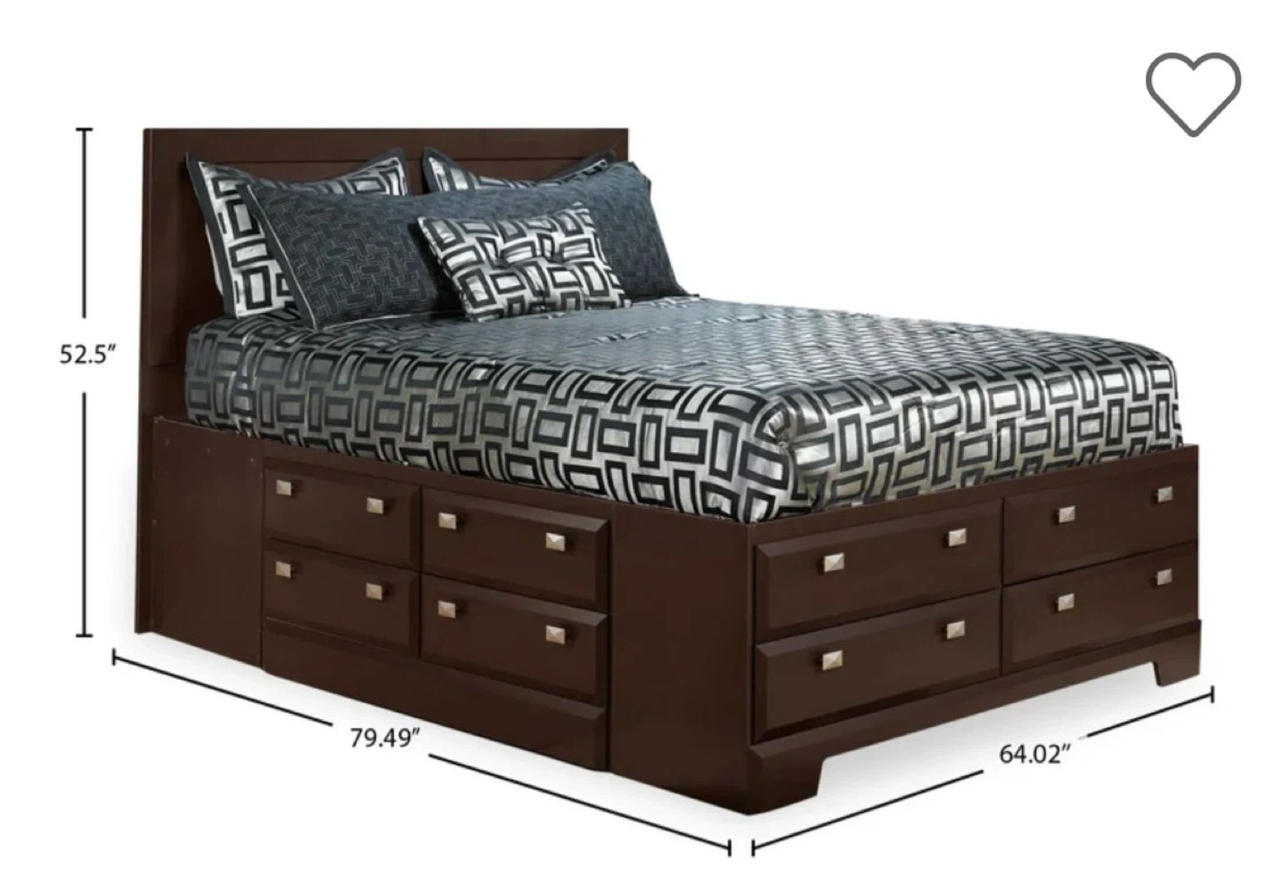 Queen size bed frame in a dark brown finish. It features multiple built-in drawers for ample storage. The overall dimensions are approximately 79.5" long by 64" wide with a headboard height of 52.5". This bed frame is perfect for organizing bedrooms!
