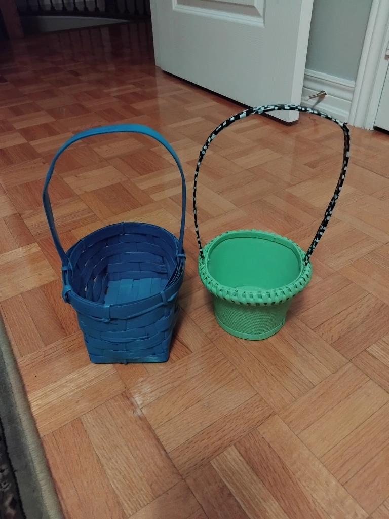 Selling two cute decorative baskets! One is a bright blue and the other is a cheerful green. They're perfect for adding a pop of colour to any room