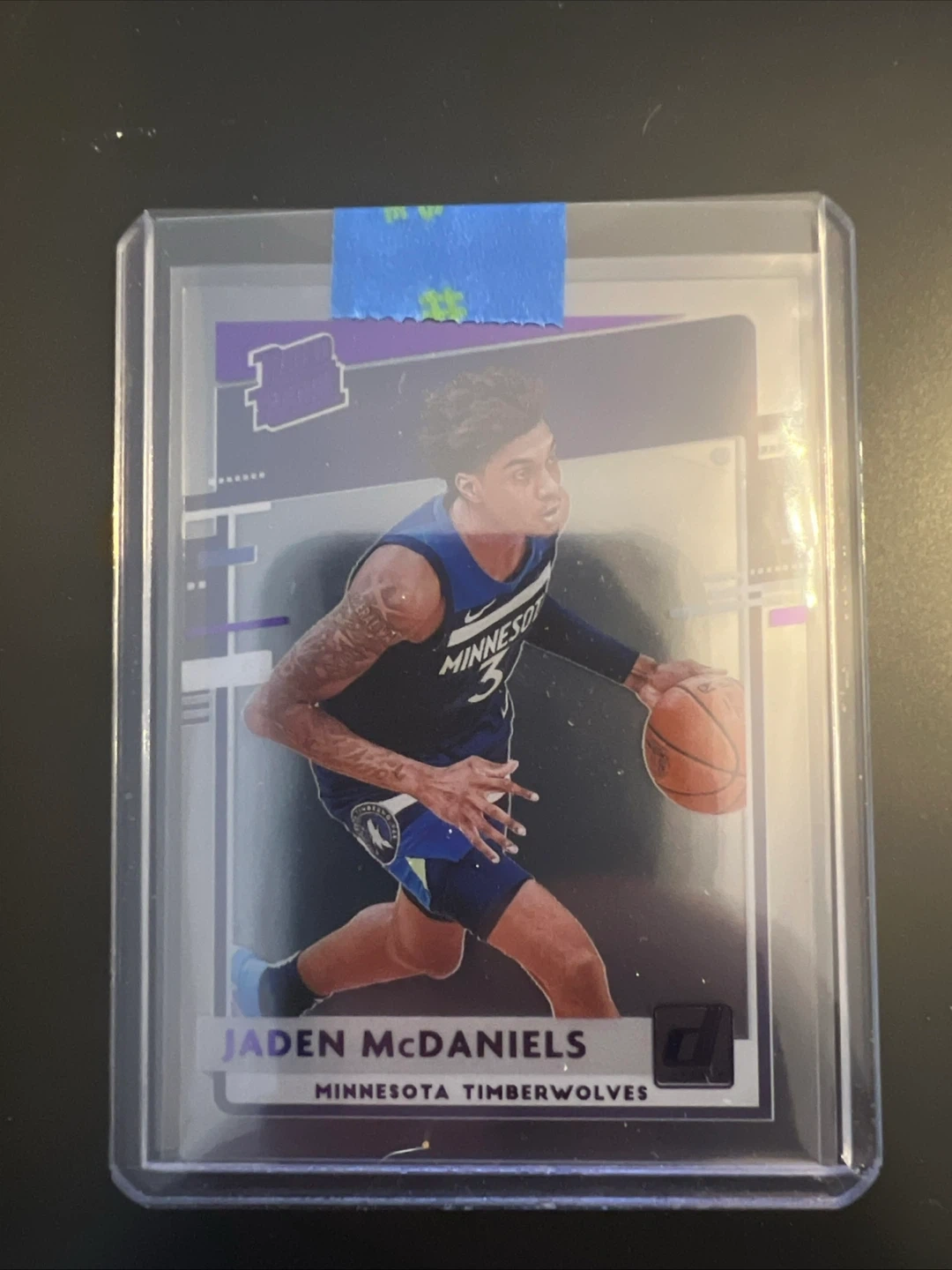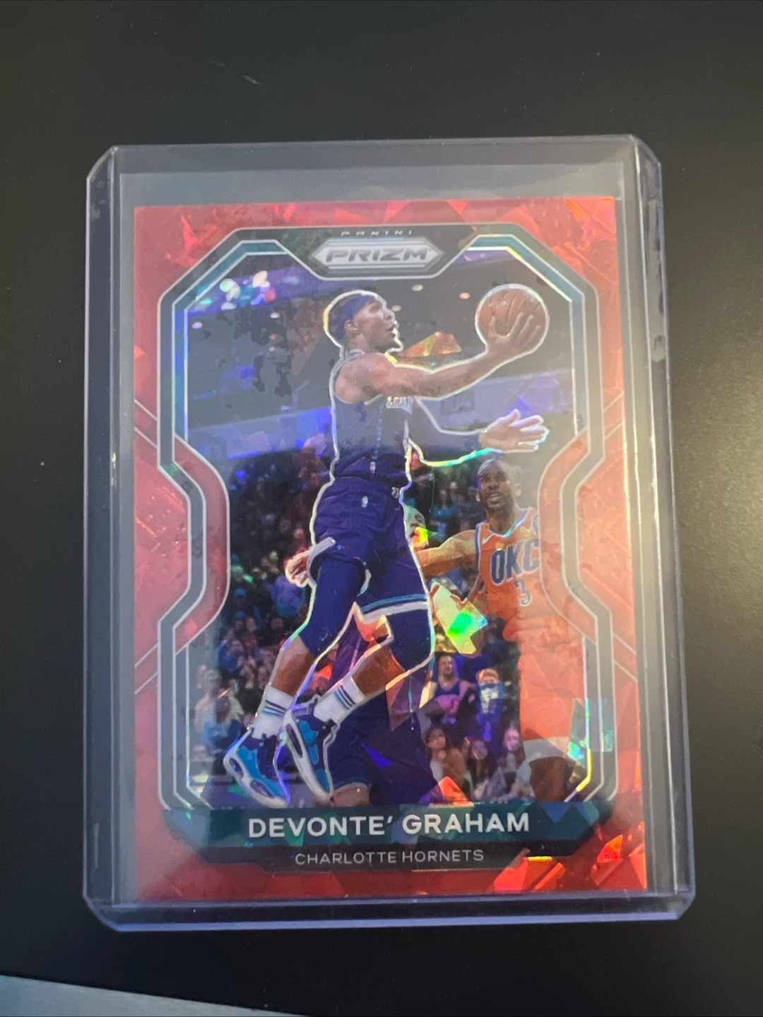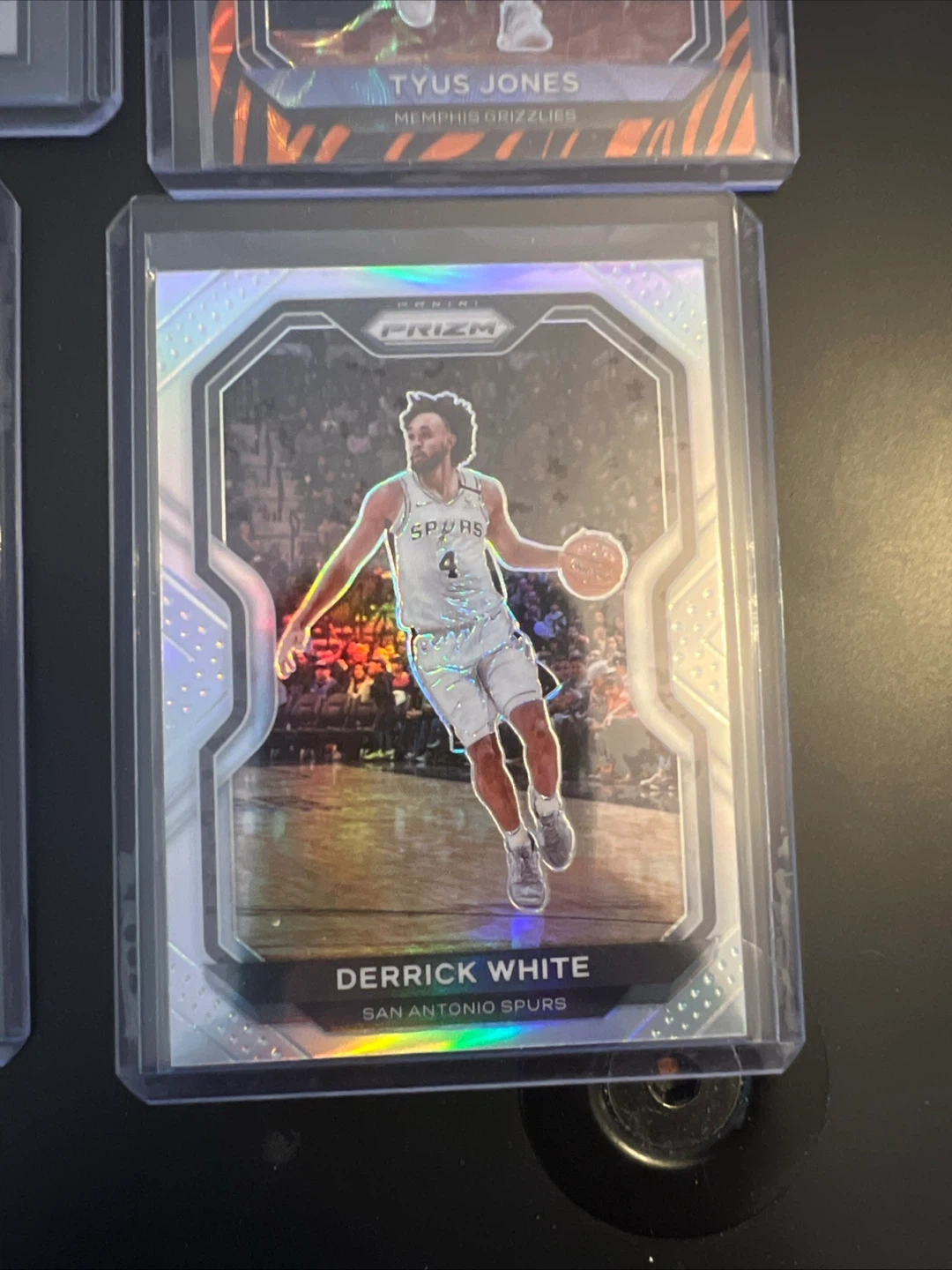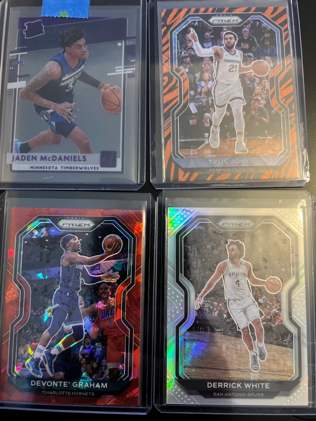 Collection of Panini Prizm NBA trading cards featuring Devonte' Graham, Jaden McDaniels, Tyus Jones, and Derrick White. Cards are in protective sleeves.