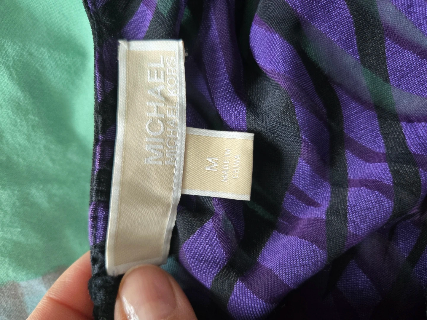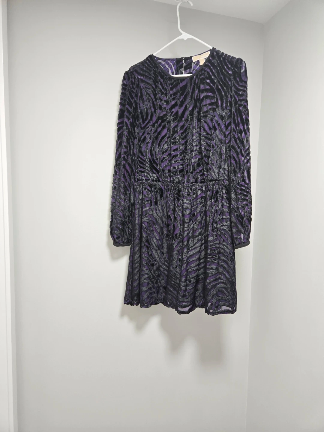 Michael Kors long-sleeved dress in a striking purple and black zebra print. It's a size medium with a comfortable, cinched waist. Shell is 100% polyester, lining is 100% nylon. This dress is perfect for a night out!