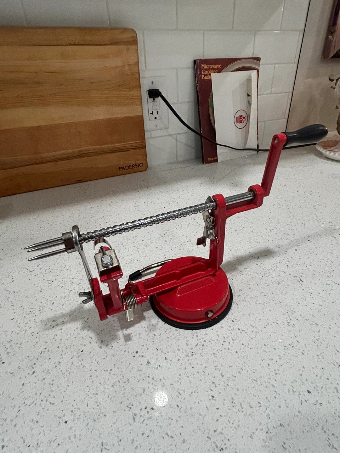 Selling a red apple peeler in great condition! It's perfect for quickly peeling apples for pies, crisps, or just a healthy snack. It has a suction base to keep it stable on your countertop. Easy to use and clean (never been used)