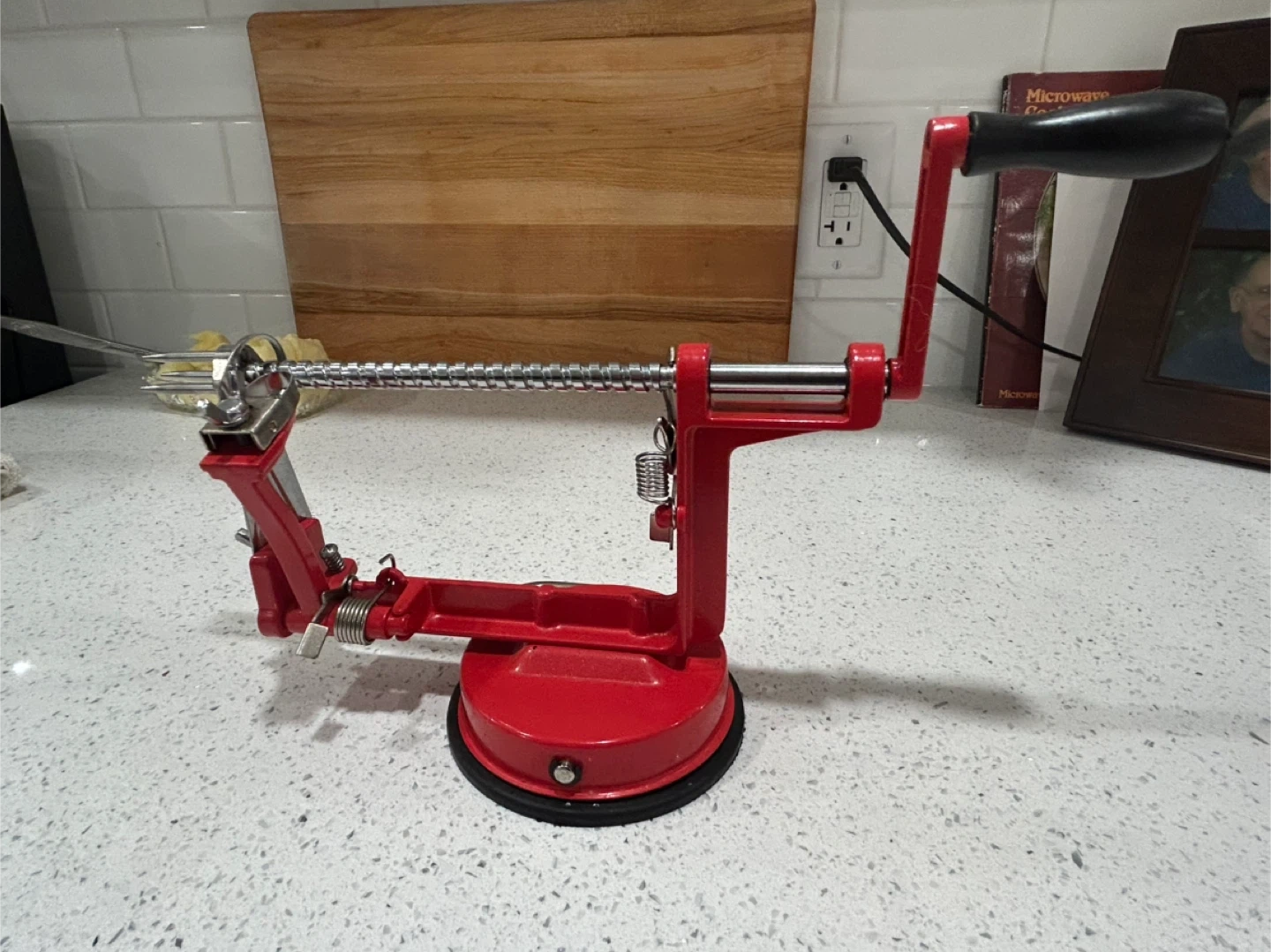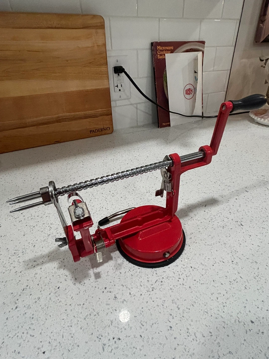 Selling a red apple peeler in great condition! It's perfect for quickly peeling apples for pies, crisps, or just a healthy snack. It has a suction base to keep it stable on your countertop. Easy to use and clean (never been used)