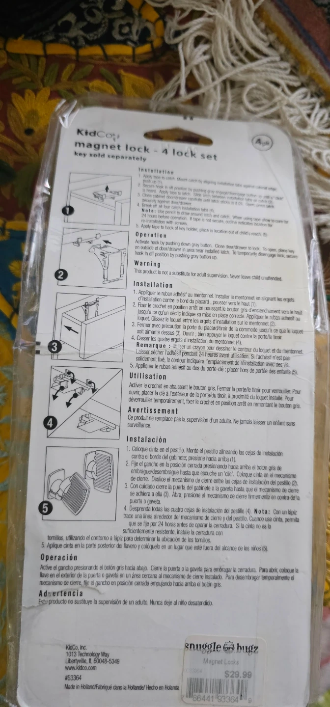 This KidCo magnetic lock set includes 4 locks for child safety. They penetrate over 1" of solid wood and feature an automatic locking mechanism. EZ installation requires no tools.