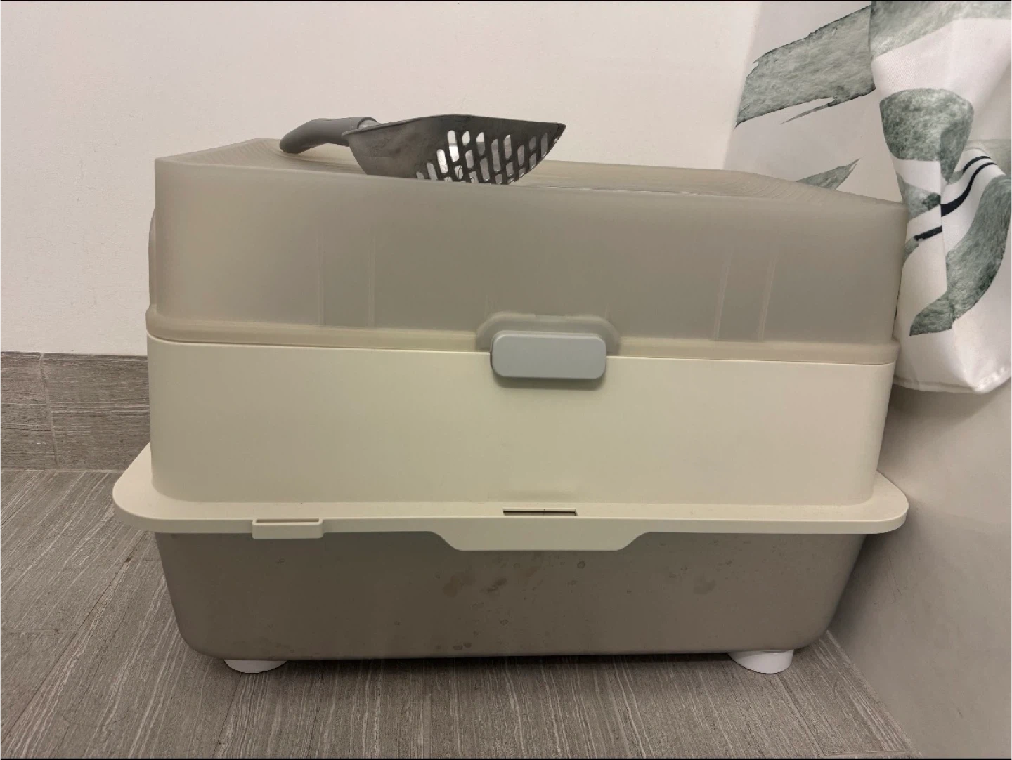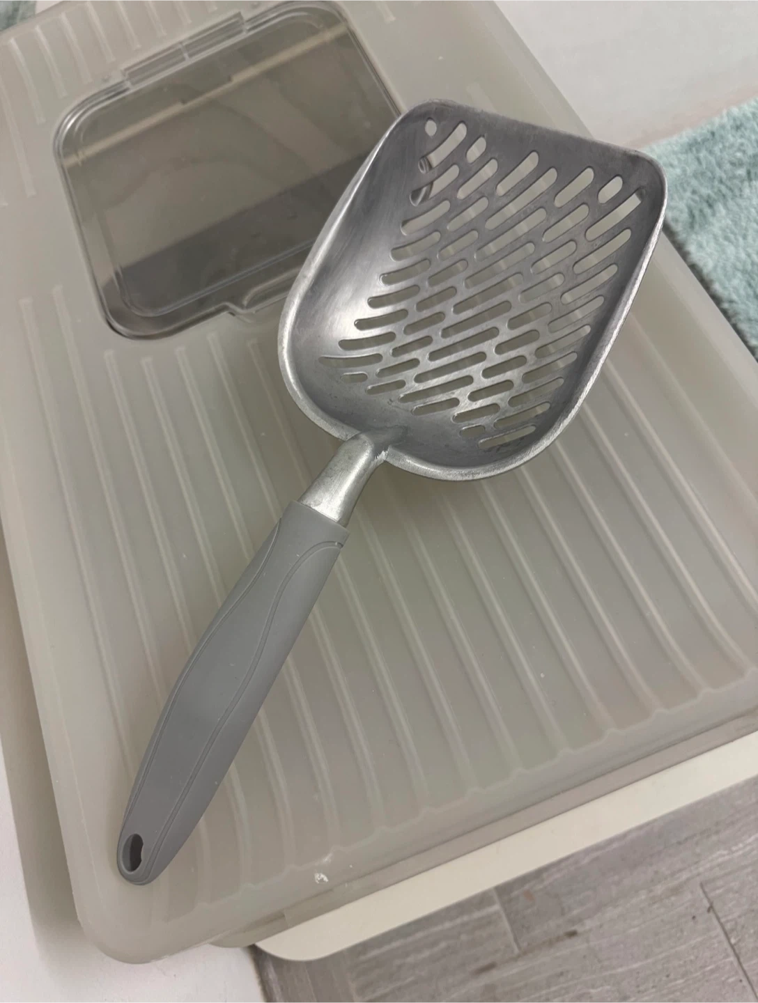 Selling a stainless steel covered cat litter box that helps contain messes and odors. It comes with a scoop for easy cleaning. The litter box is in good condition and ready for a new home!
