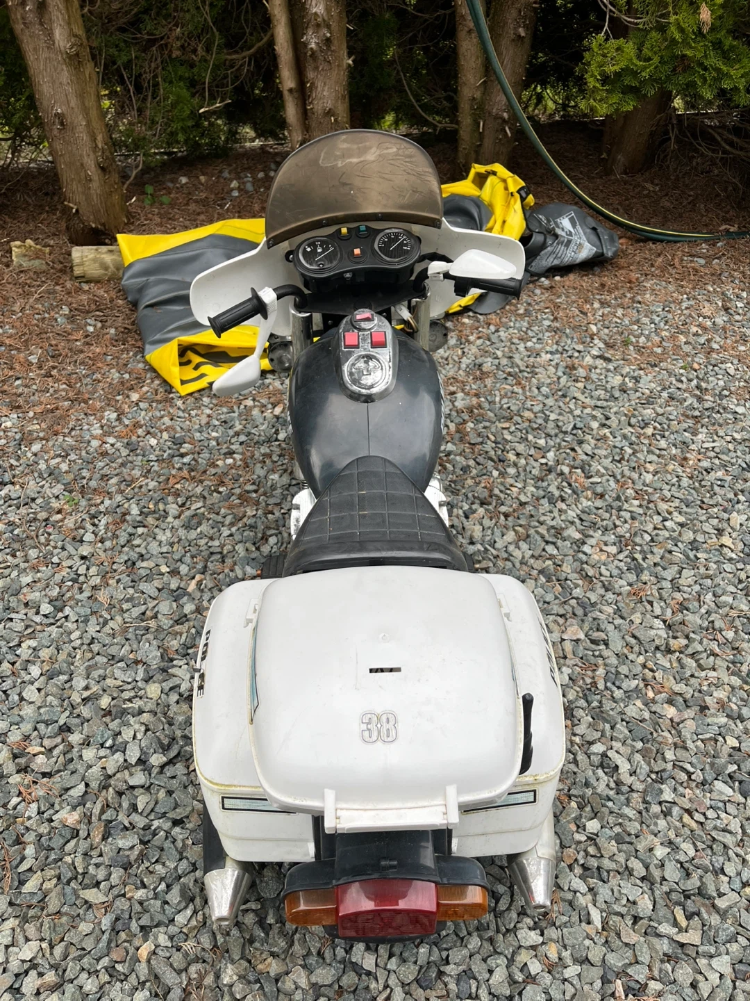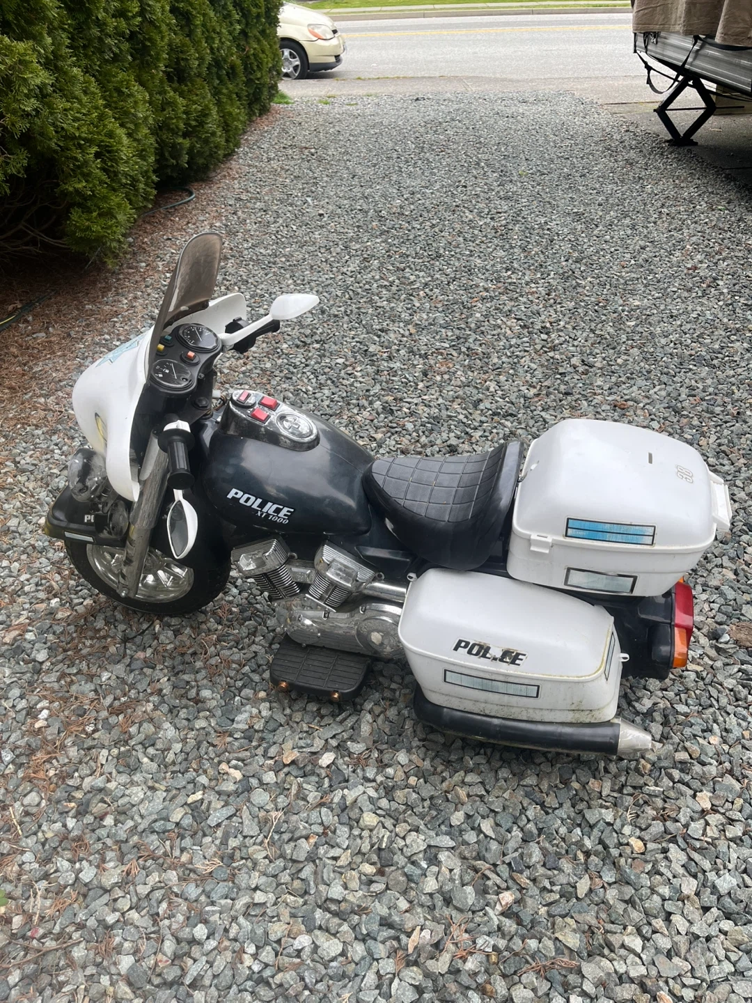 This is a kids' ride-on police motorcycle. It comes with saddlebags for storage and a windshield. Includes charger and wires.