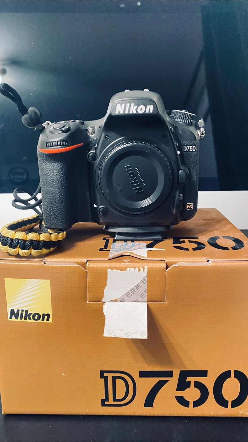 This is a Nikon D750 DSLR camera. It's black with red accents. Includes original box. Comes with all original accessories and 2 after market additional batteries