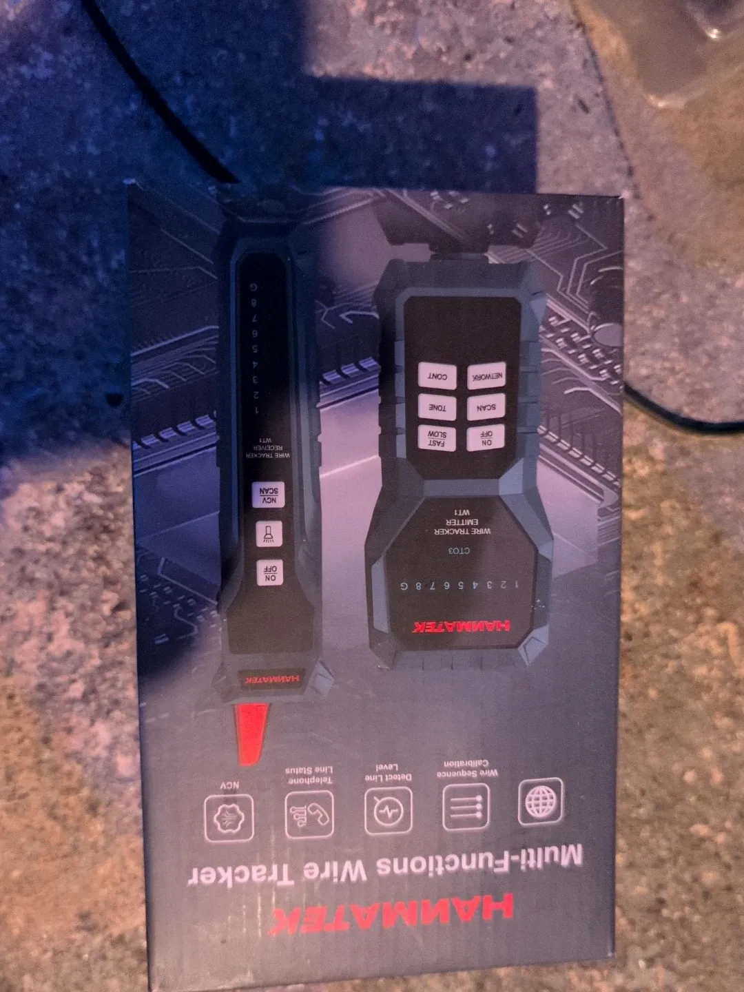 This HAMMATEK wire tracker set is used for tracing wires. It includes a receiver and emitter with multiple functions like line status detection and wire sequence calibration. This tool helps identify network cables and detect line levels.