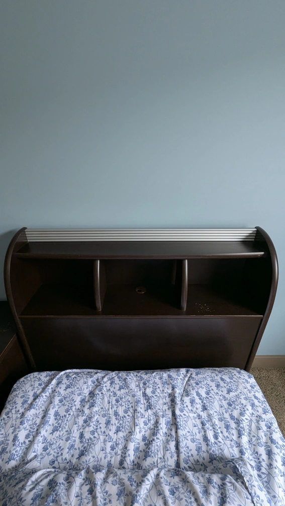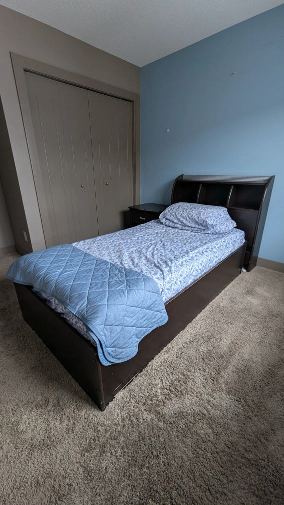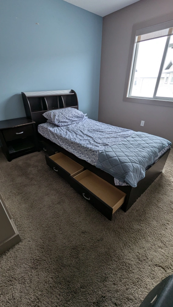 Dark brown twin-size bed frame with built-in headboard shelving and three under-bed drawers. Matching nightstand included. Some minor scratches present. Mattress included.