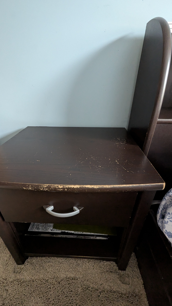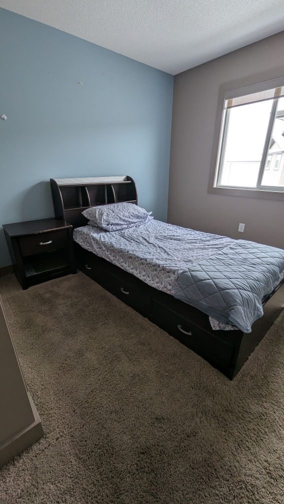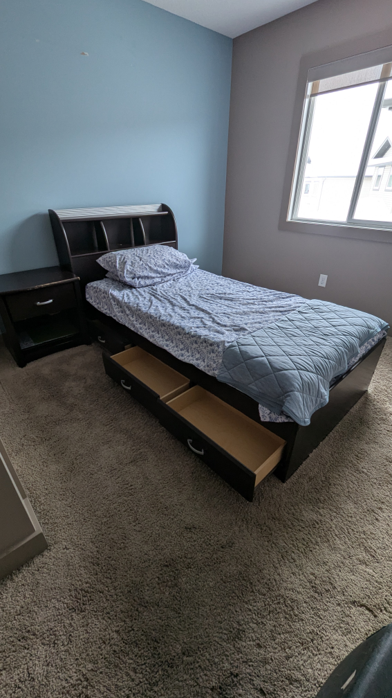 Dark brown twin-size bed frame with built-in headboard shelving and three under-bed drawers. Matching nightstand included. Some minor scratches present. Mattress included.