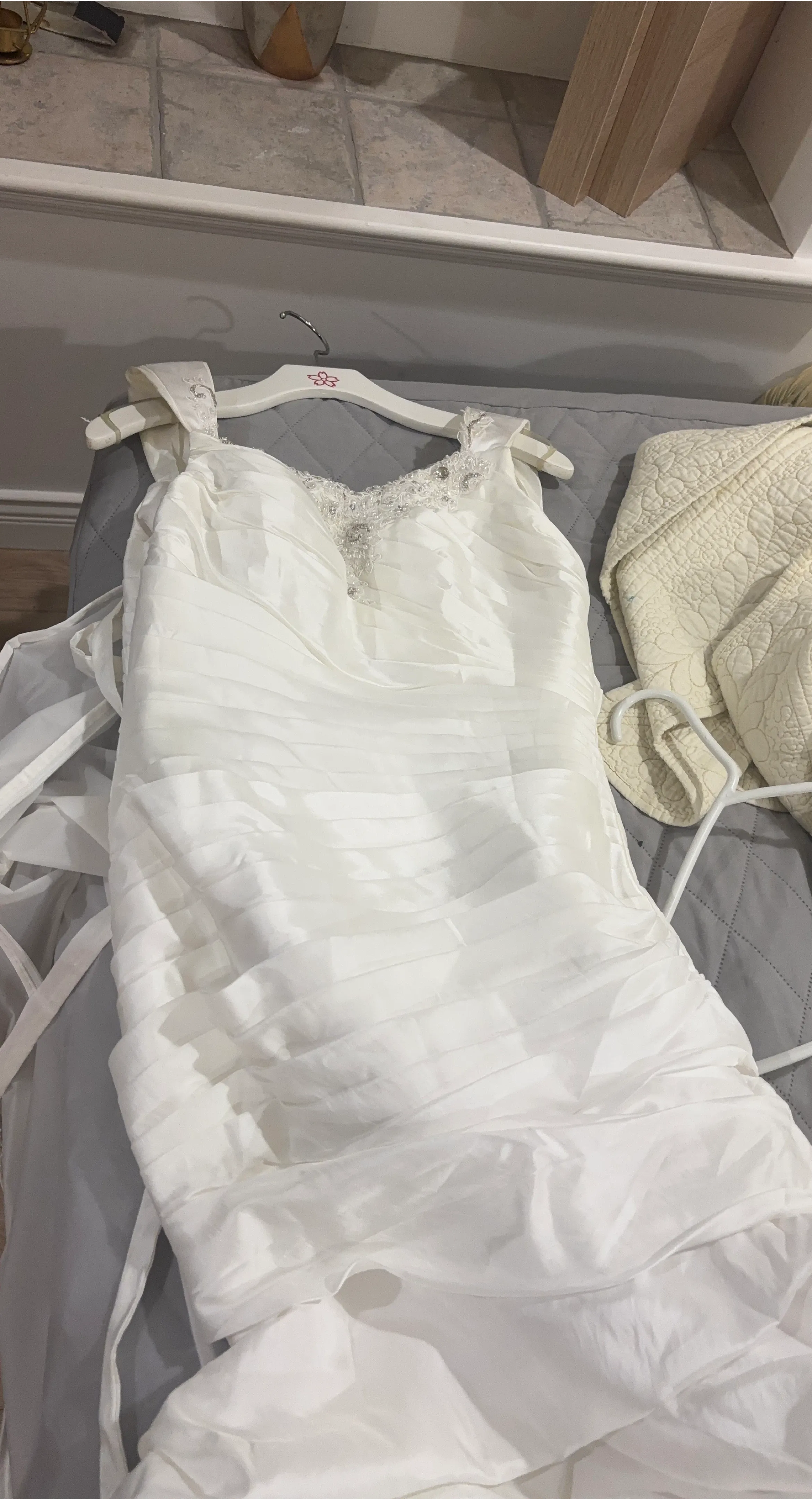 Selling a beautiful white wedding dress. It has a lovely design with some beaded detailing around the neckline. It's in great condition and ready for its special day!