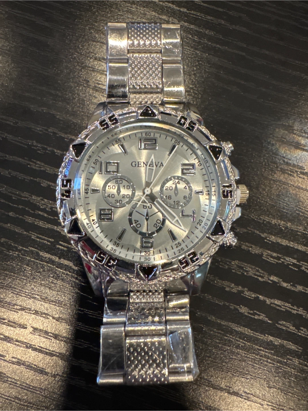 This is a Geneva chronograph watch with a silver-tone metal band. It features a round dial with hour markers and sub-dials. The bezel is embellished and has numbers around it.