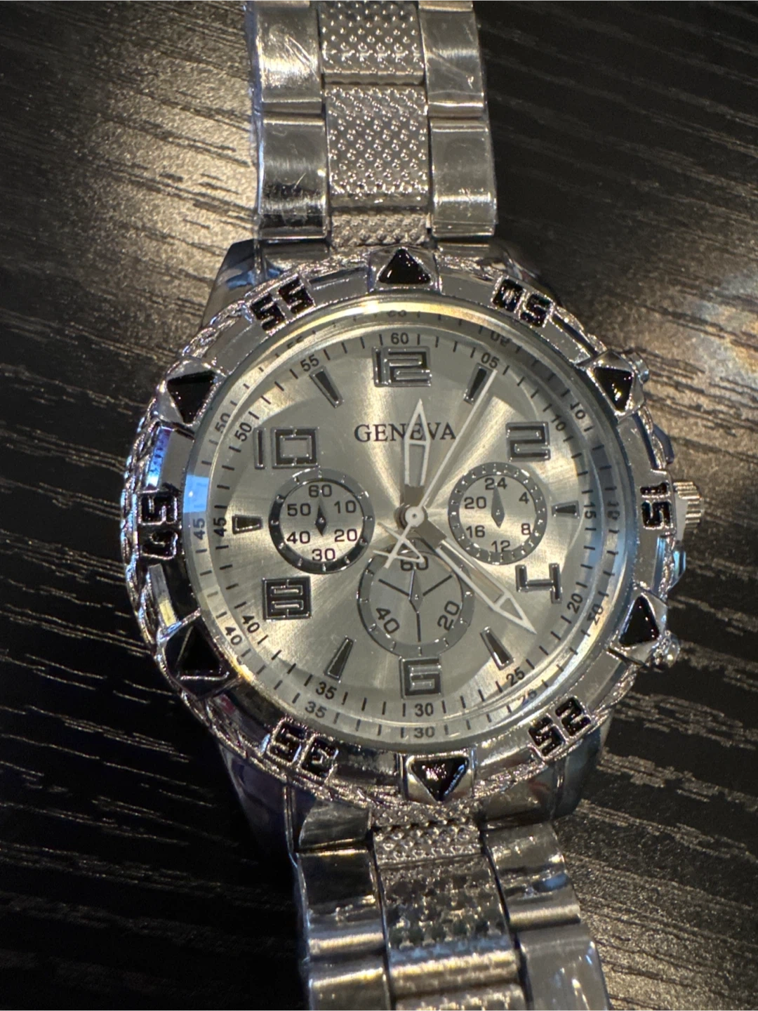 This is a Geneva chronograph watch with a silver-tone metal band. It features a round dial with hour markers and sub-dials. The bezel is embellished and has numbers around it.