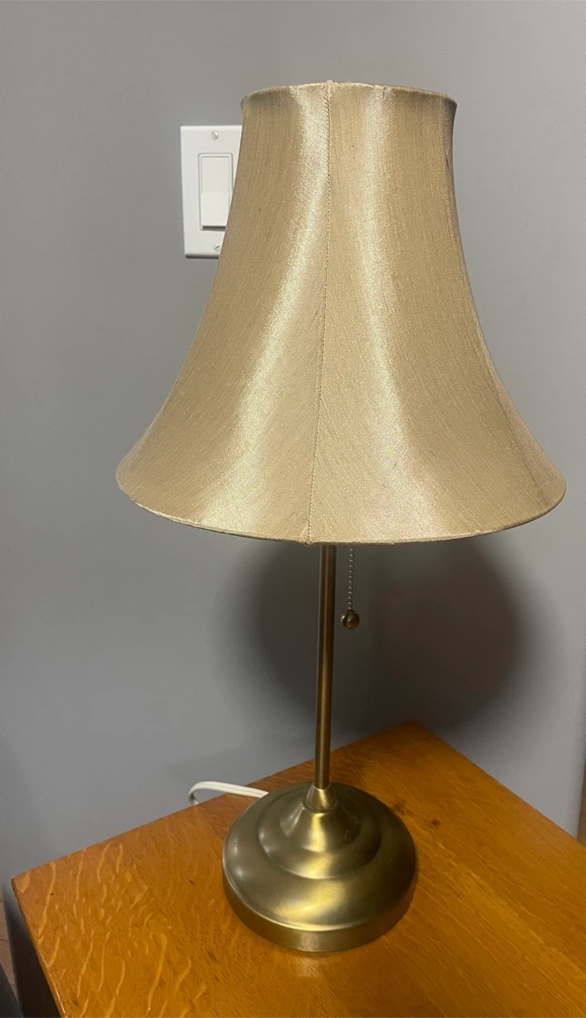 Illuminate your space with this elegant table lamp, perfect for adding a touch of warmth to any room. Featuring a classic design with a golden base and a complementary shade, this lamp stands approximately 21 1/2 inches tall, offering both style and functionality. This is a used item and in excellent condition