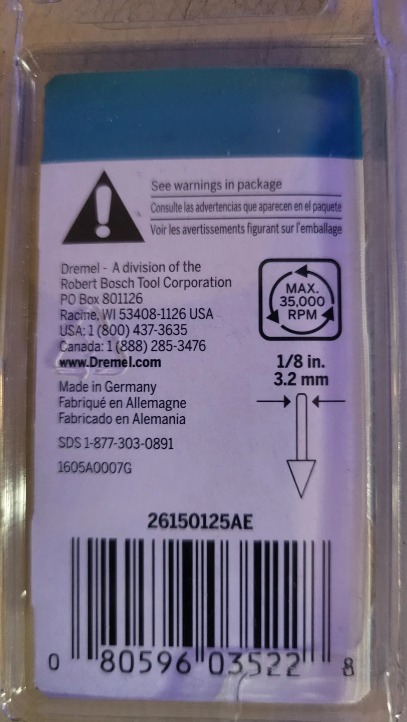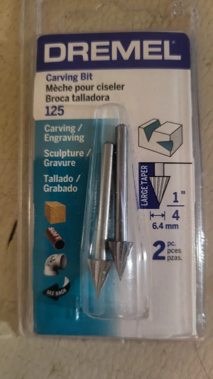 This is a brand new 2-piece set of Dremel carving and engraving bits. They're designed for carving, engraving, and sculpting. The bits are 1/8 inch (3.2 mm) in diameter.