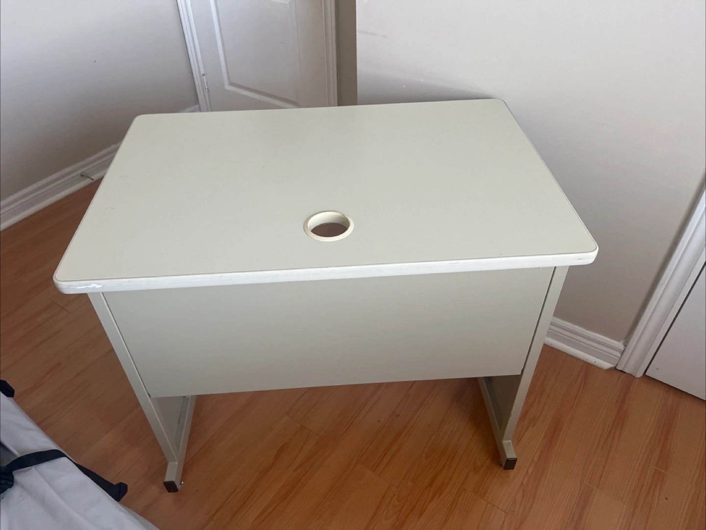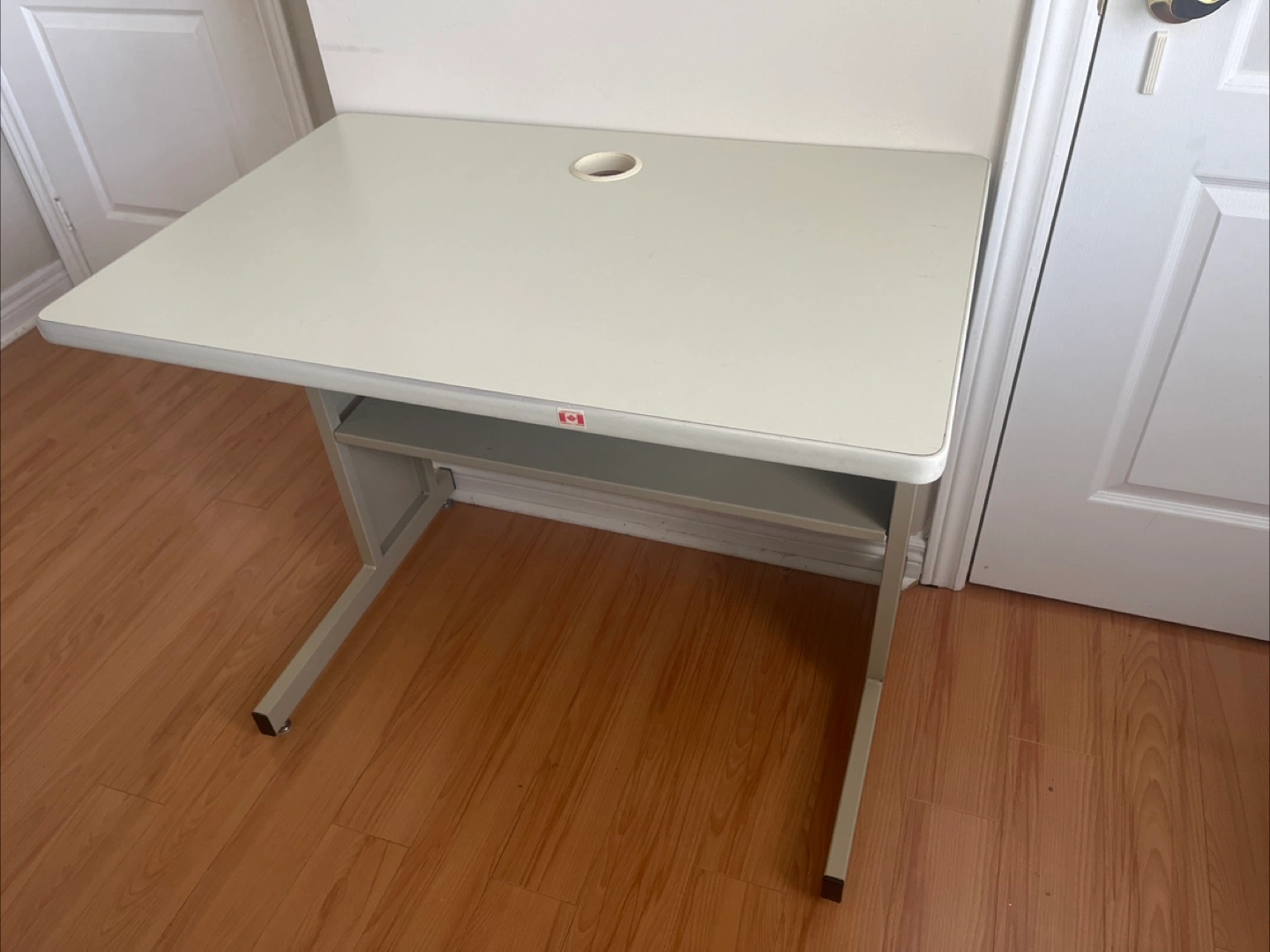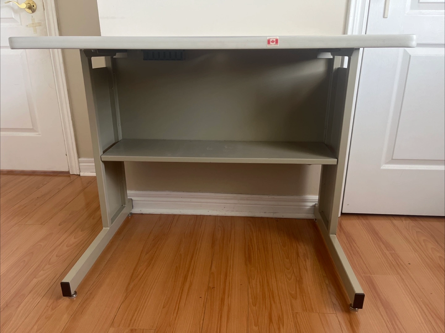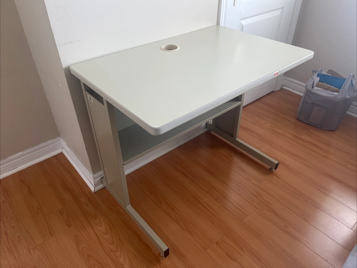 Selling a beige desk that's in good condition! It features a handy shelf underneath for extra storage. Perfect for a home office or study space