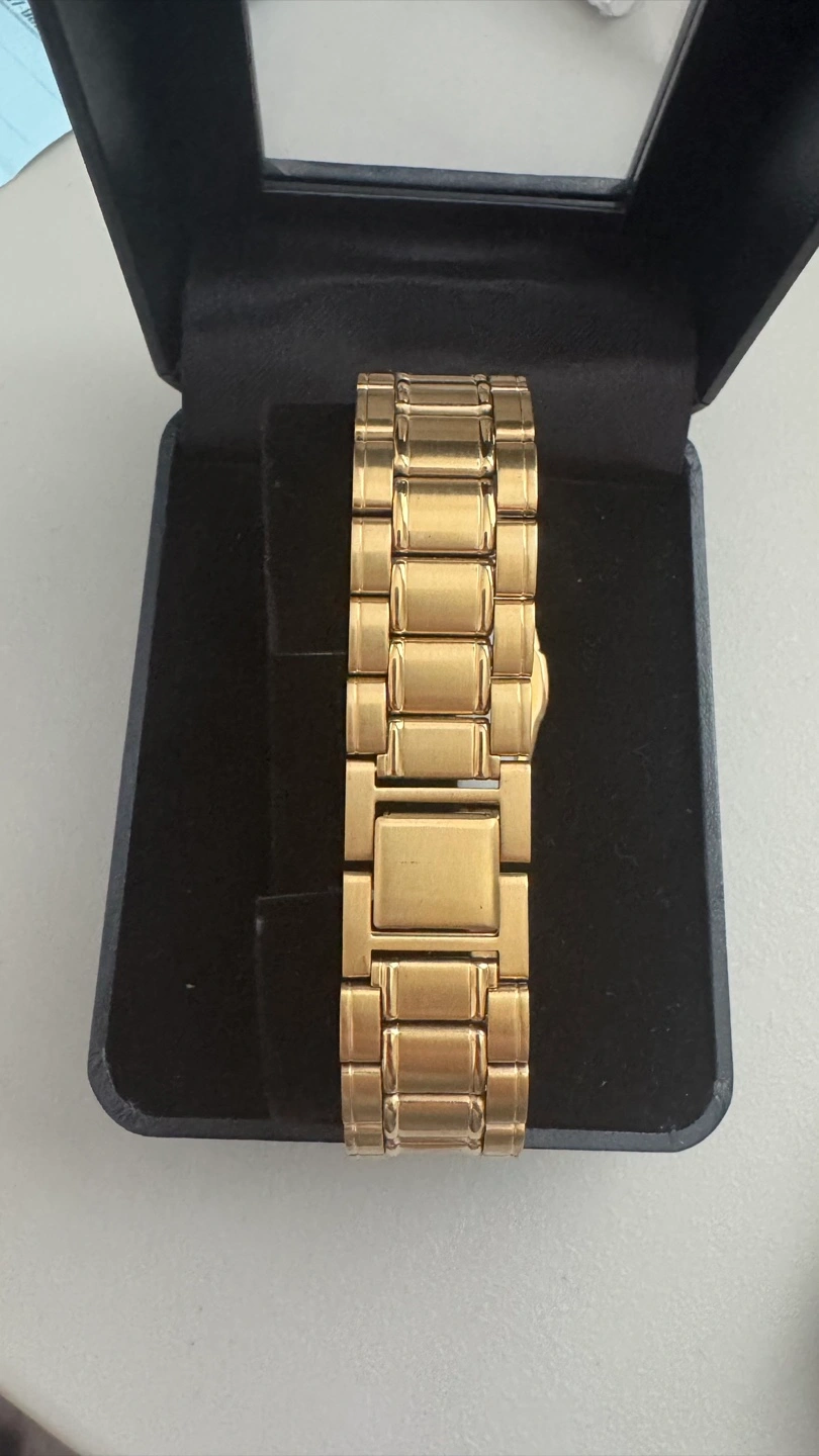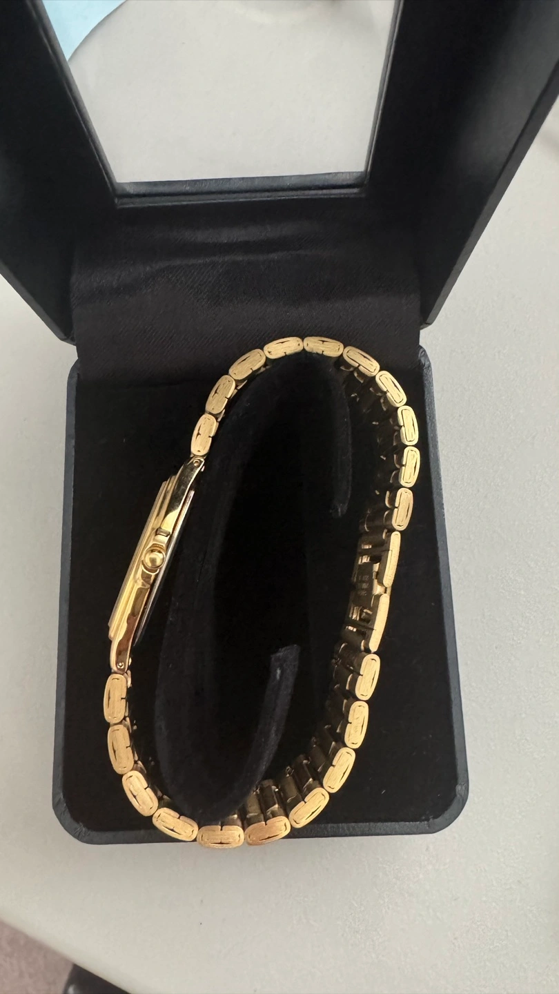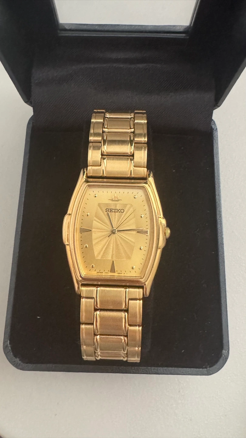Elegant gold Seiko wristwatch. Features a gold-toned bracelet and a rectangular face. Presented in a black box.